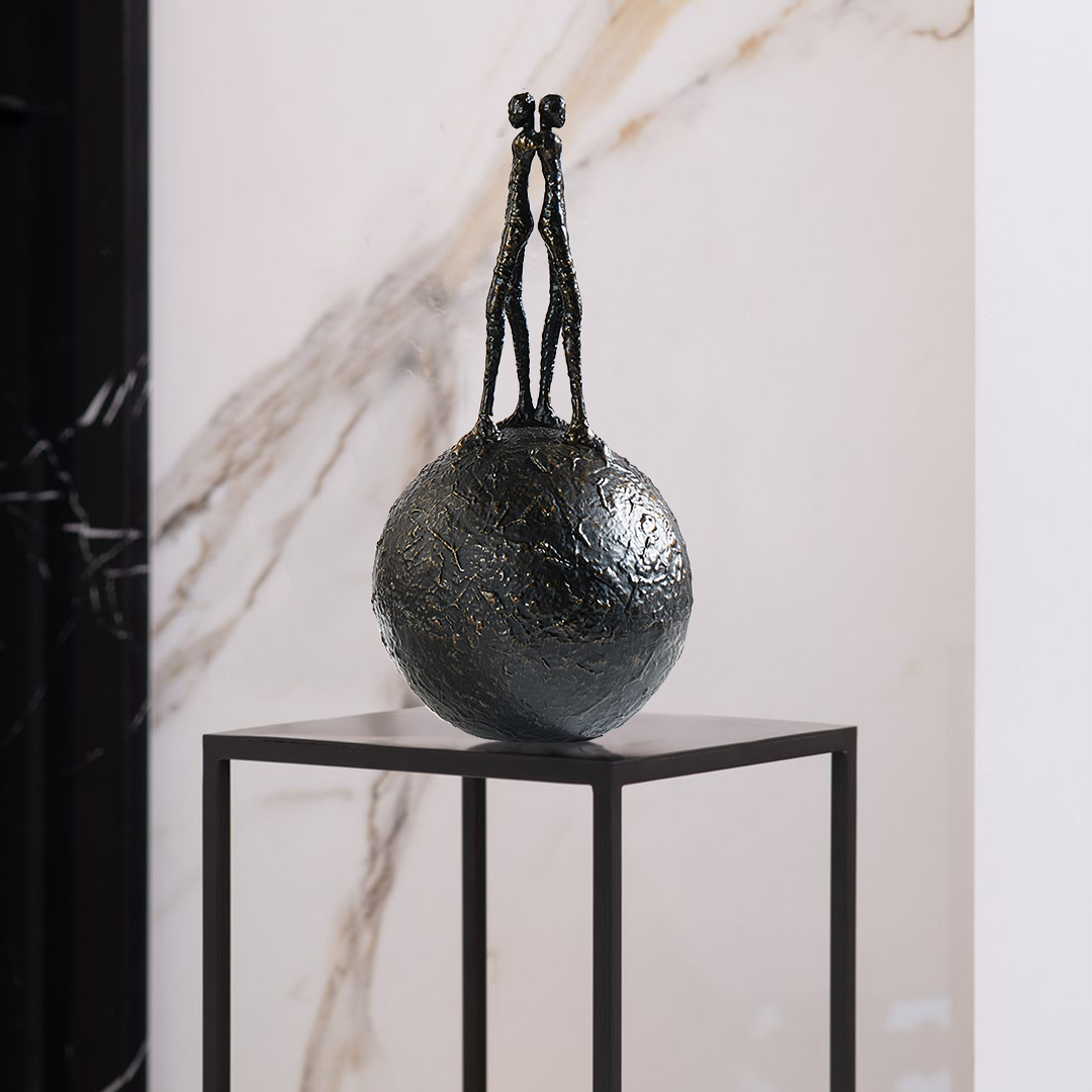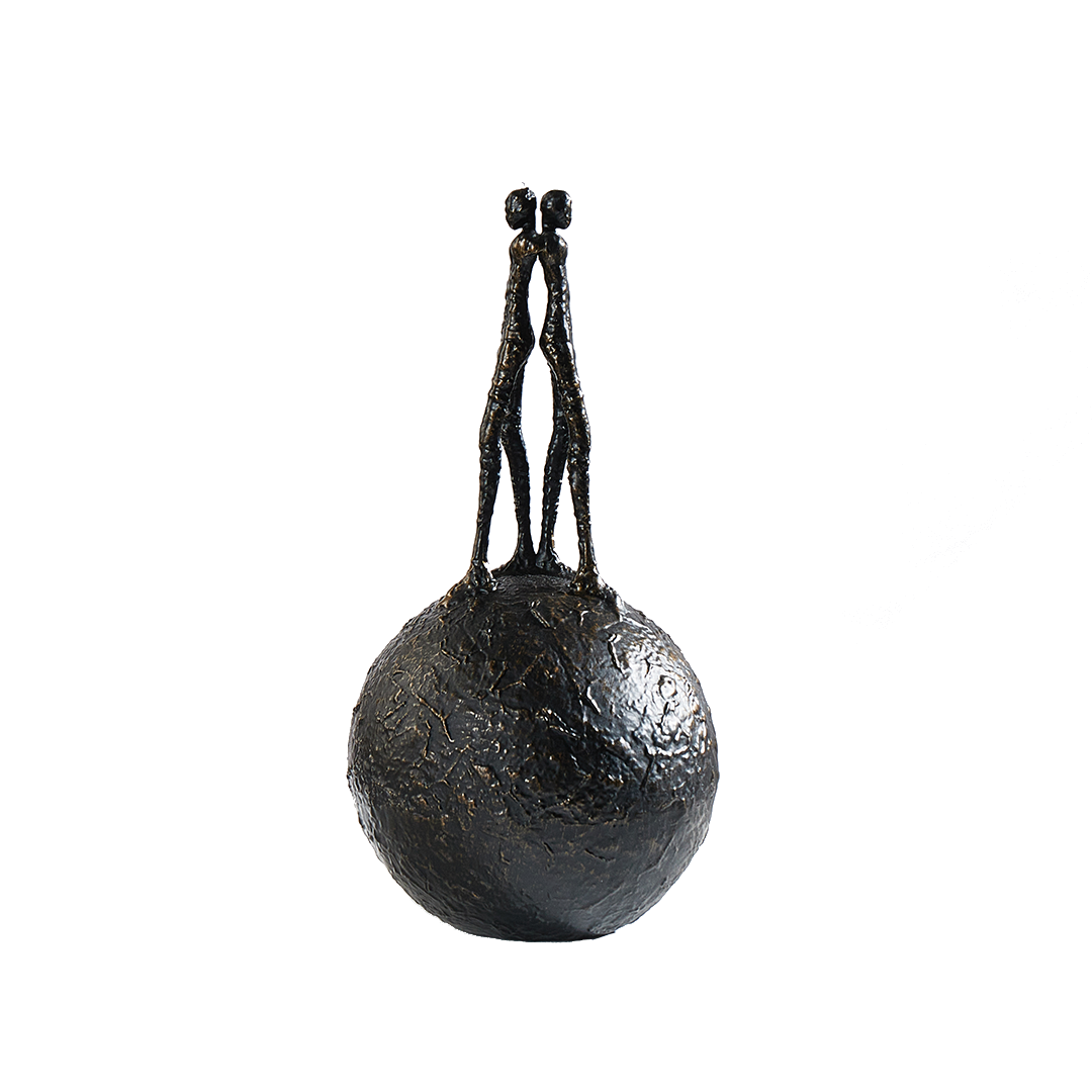 This striking black sculpture portrays a moment of balance and symmetry, with two people perched back to back atop a large spherical base. A perfect piece for two people who are literally and figuratively on top of the world.