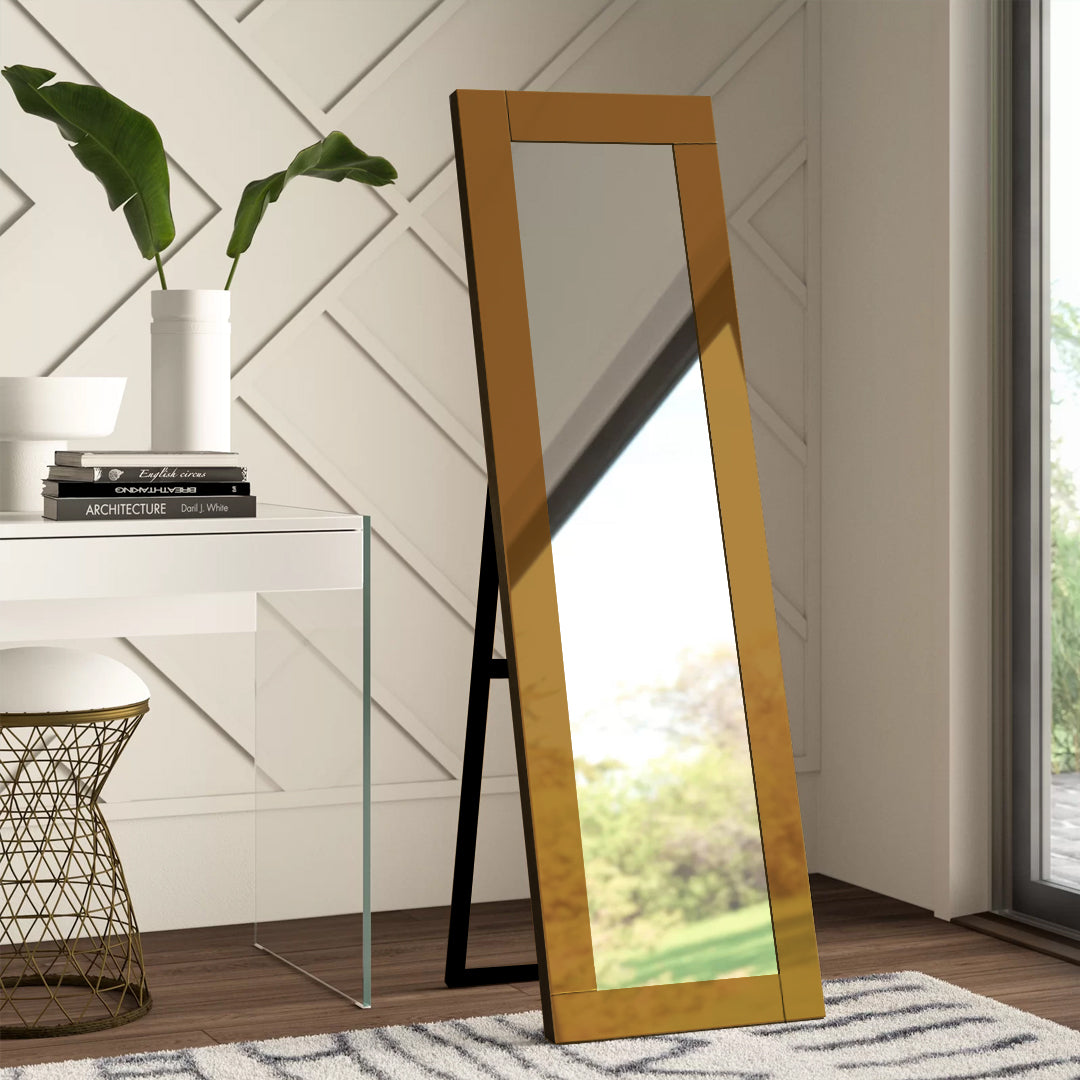 This self-standing mirror with mirror framed edges is perfect for a bedroom, dressing room, or anywhere you need to check out your reflection.