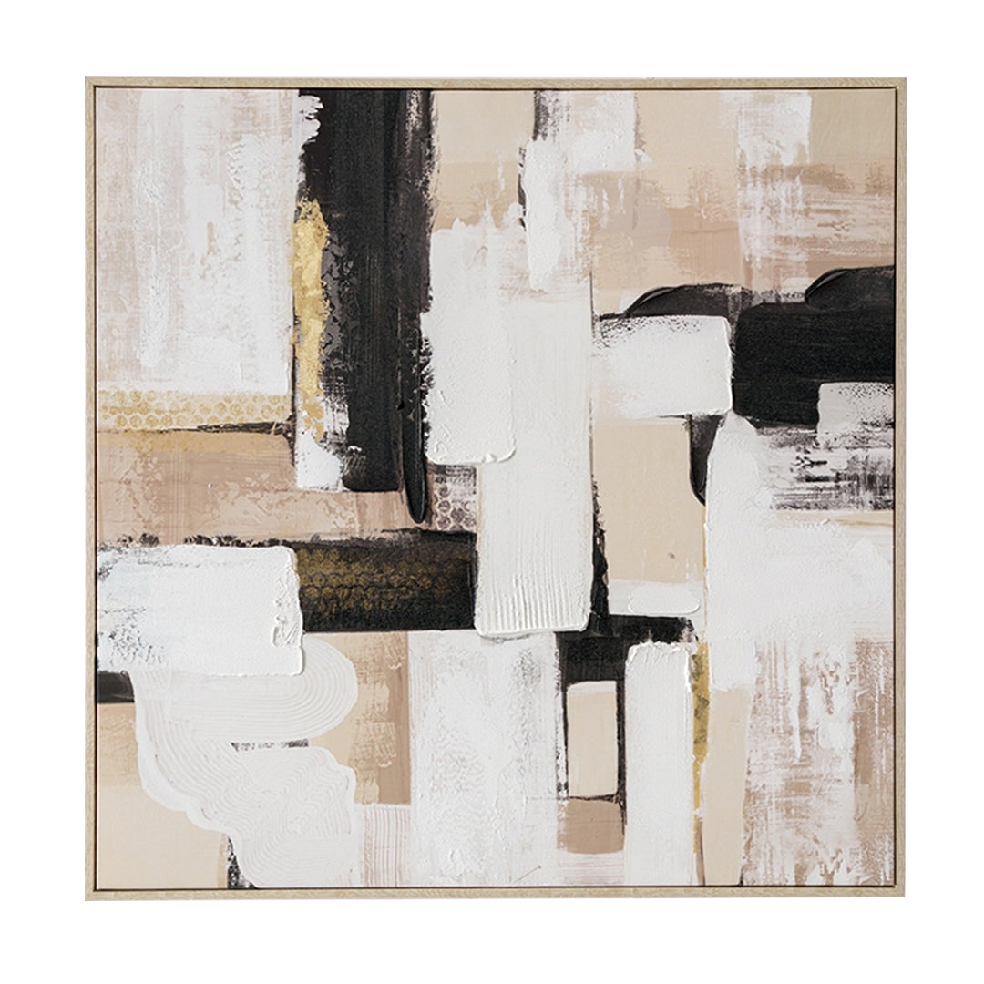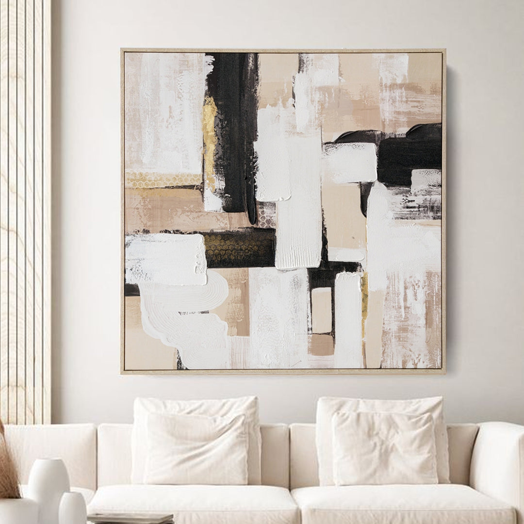 A poetic haven emerges from the interplay of black and white strokes on a neutral canvas, adorned with subtle hints of gold. This unique piece explores the depths of soul, and invokes a sense of balance and fortitude.
