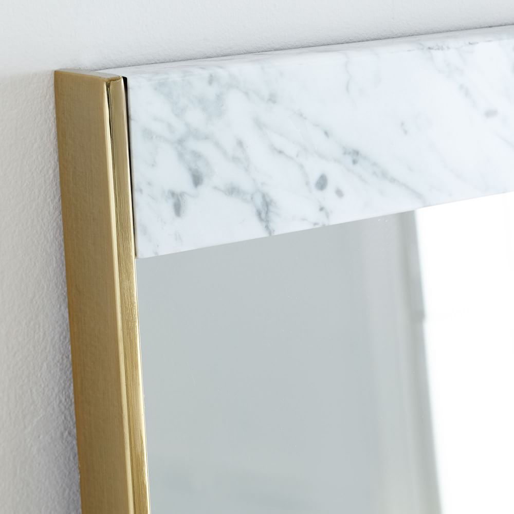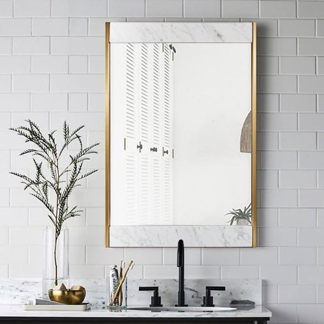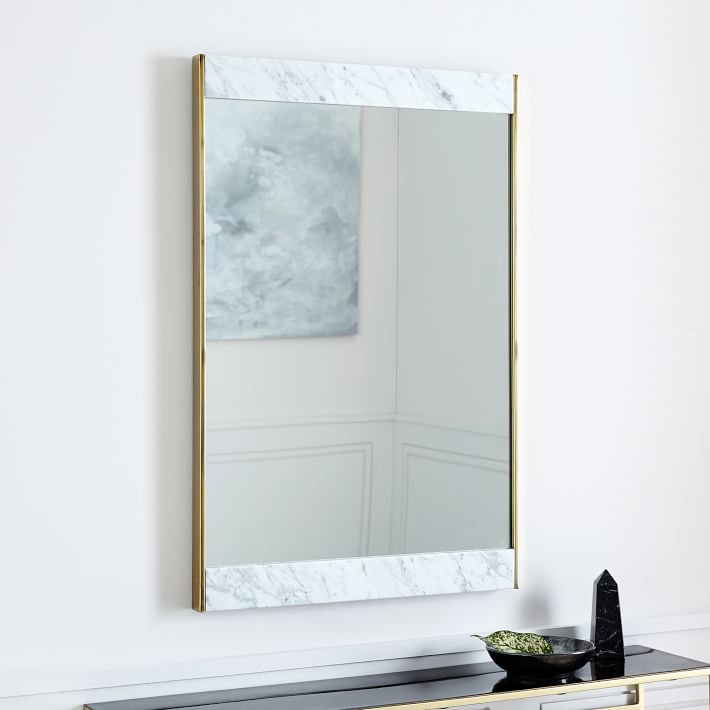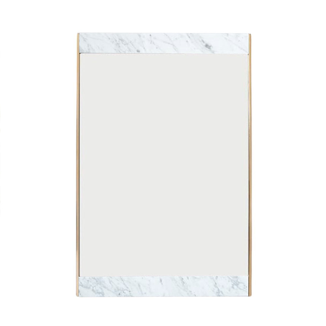 Marble meets metal to make the perfect combination that will spruce up your space with a mid-century modern twist. This piece emphasizes on enlarging spaces by diffusing natural light, and enhancing interiors with its complementing textures and materials. The unframed top and bottoms edges create a refined transition from the walls to the mirror.
