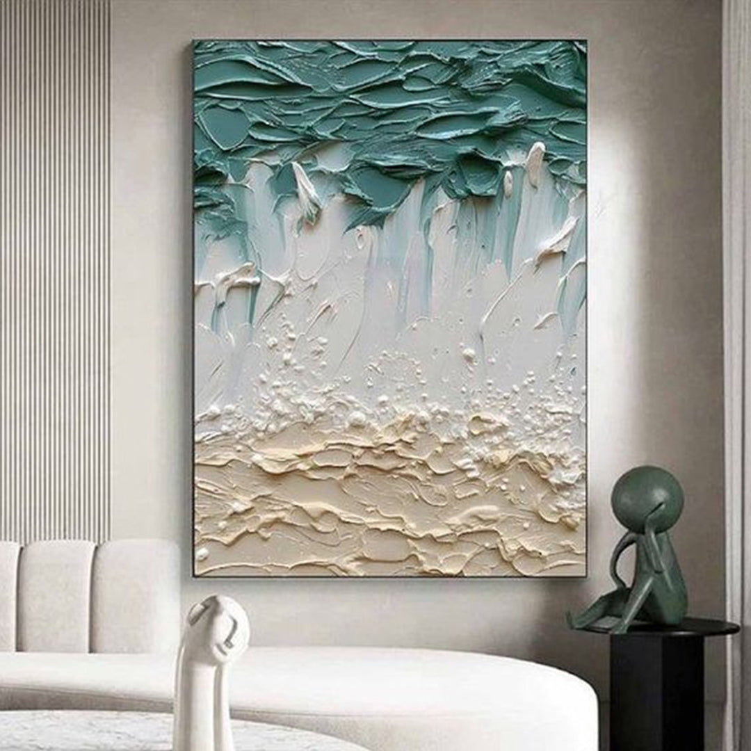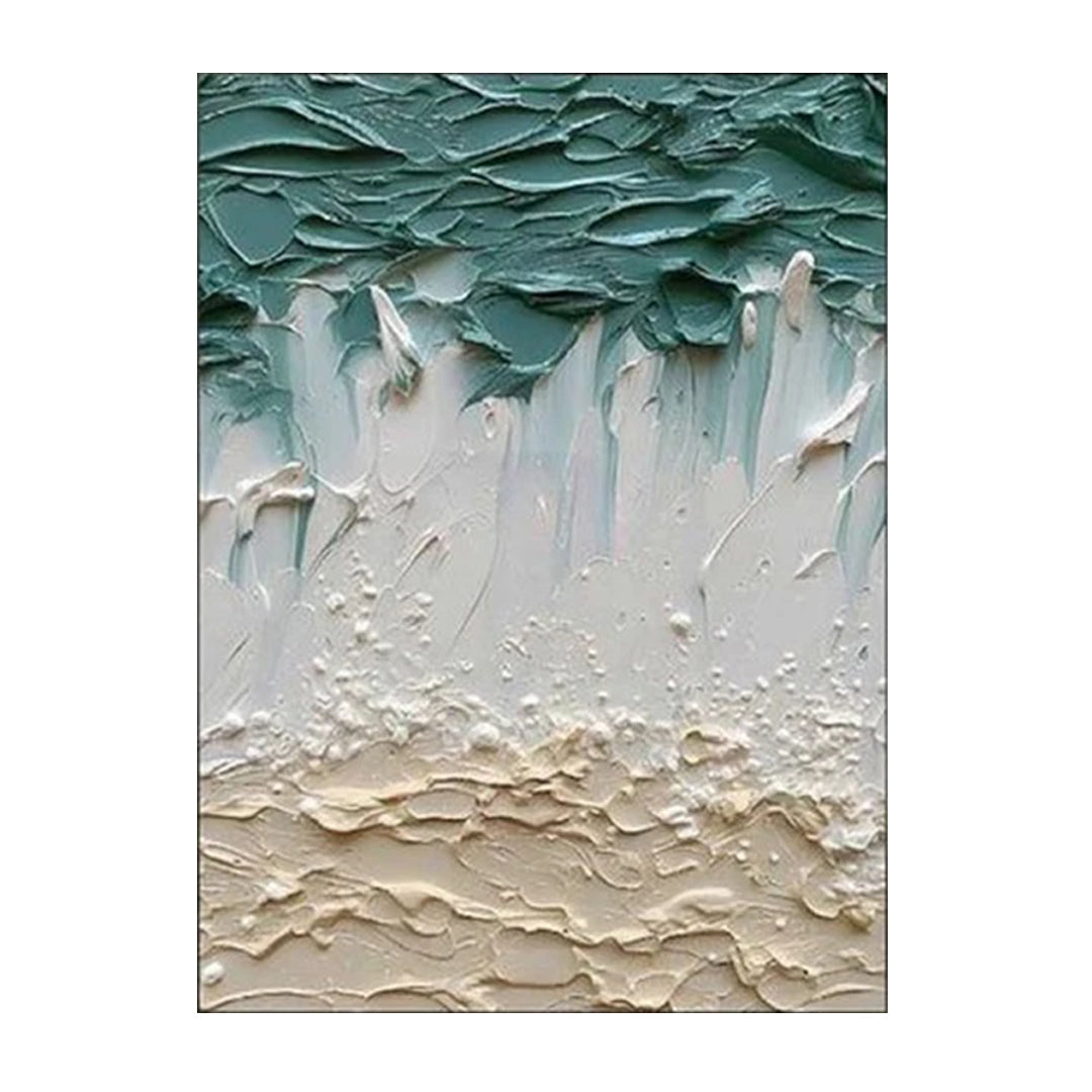 Calming teal shades and warm sandy tones with rich textured layers create a serene, balanced flow of energy symbolizing the endless harmony of water and earth elements for a blissful and tranquil atmosphere.
