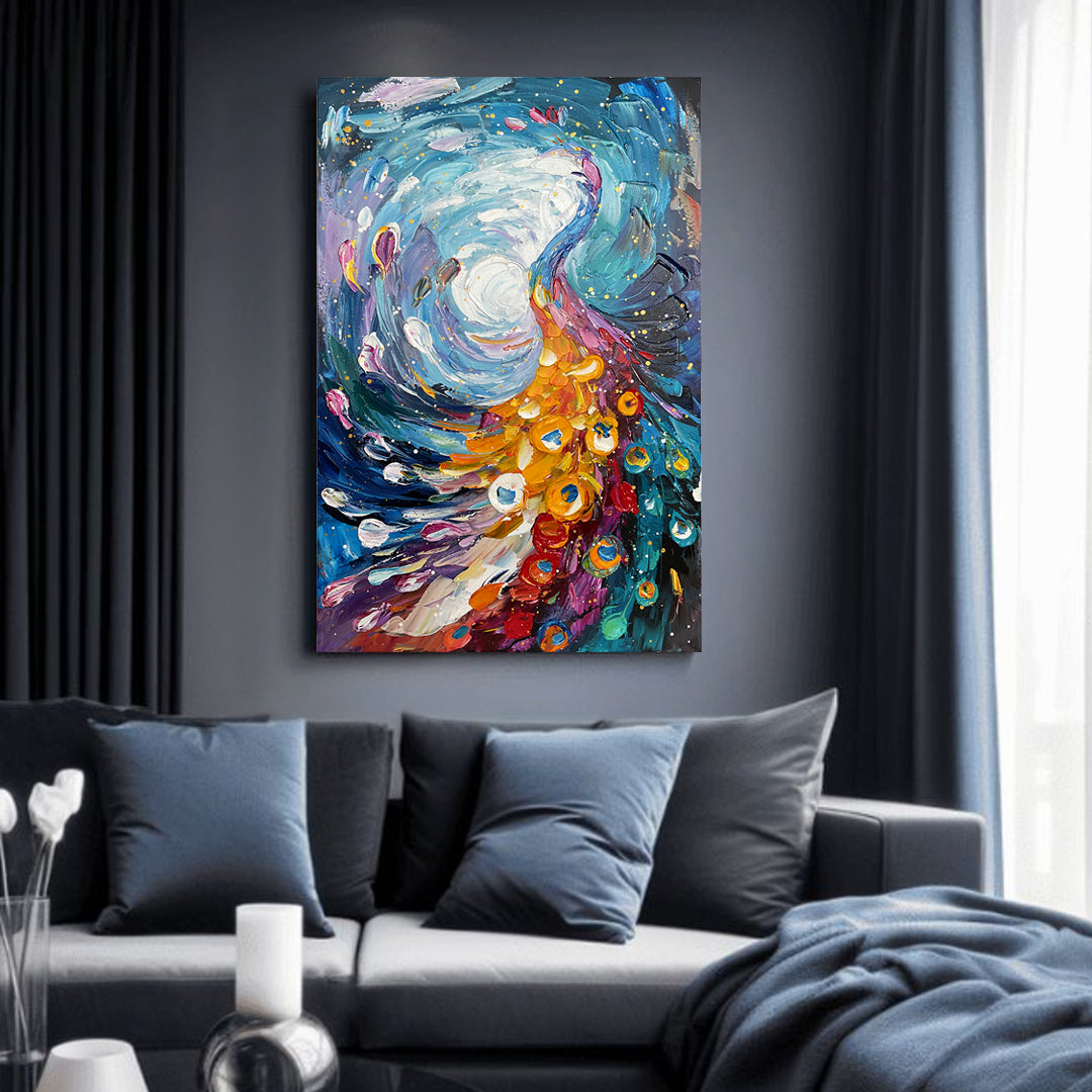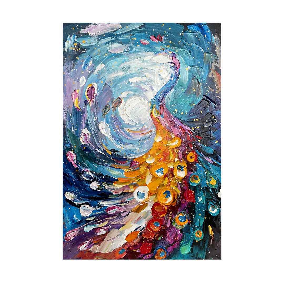 Caught between dream and reality, the peacock radiates a regal splendor, its feathers a mesmerizing sight to behold. A captivating mirage of color and light, it embodies abundance and fortune, leaving behind the magic of its beauty.