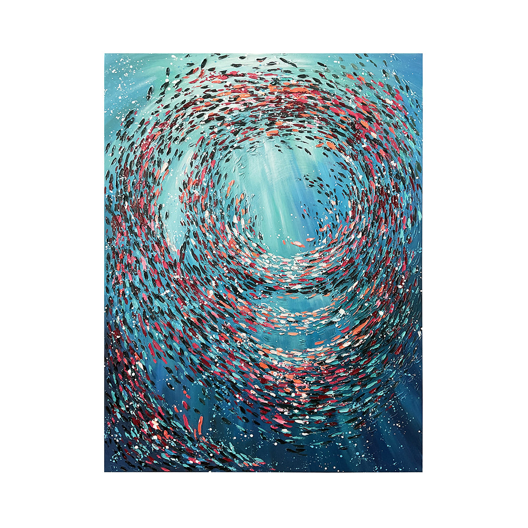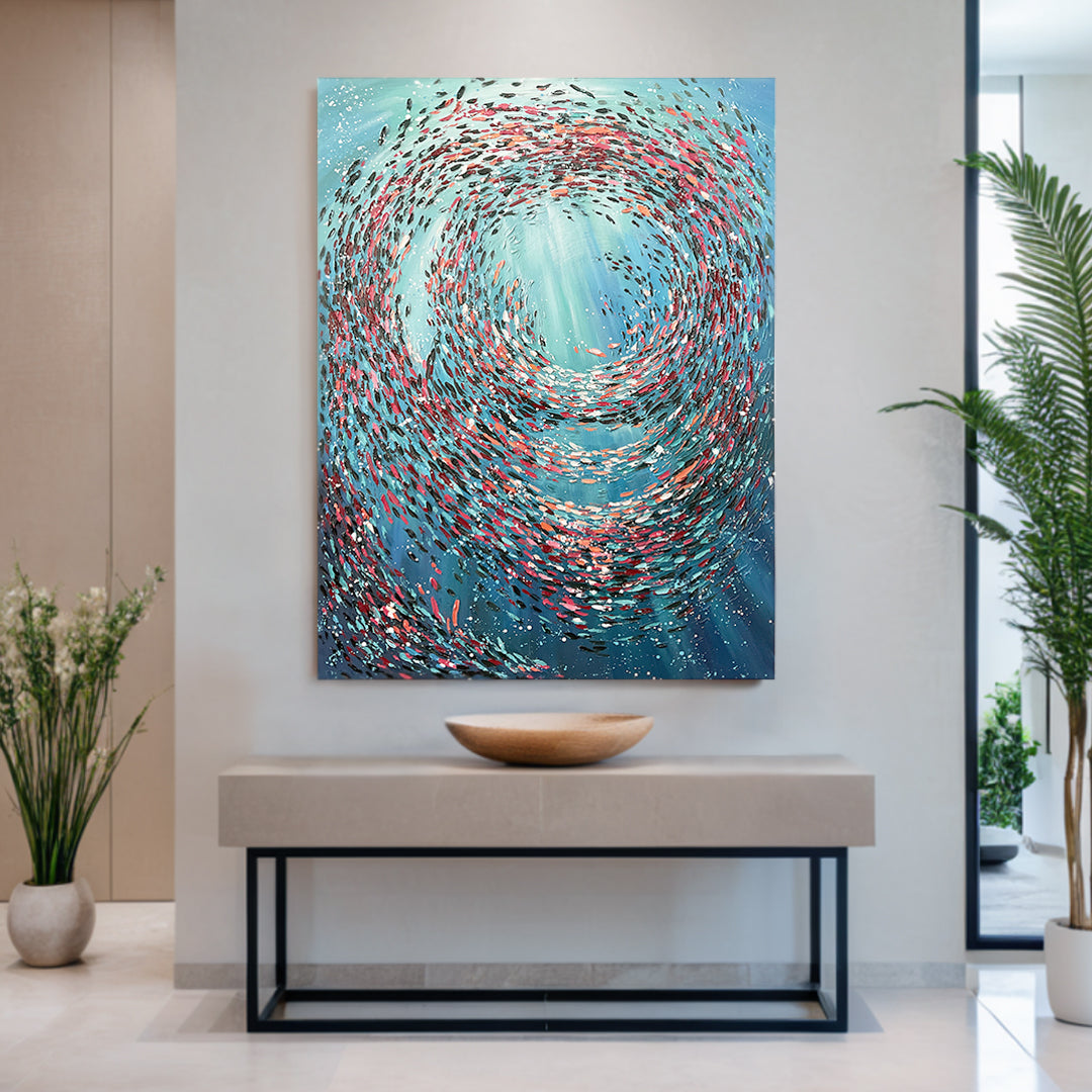 A mesmerizing school of fish glides through shifting currents of light and shadow, awash in a sea of blue. Their circular movement embodies the effortless flow of opportunity, where fortune favors those who embrace the journey.