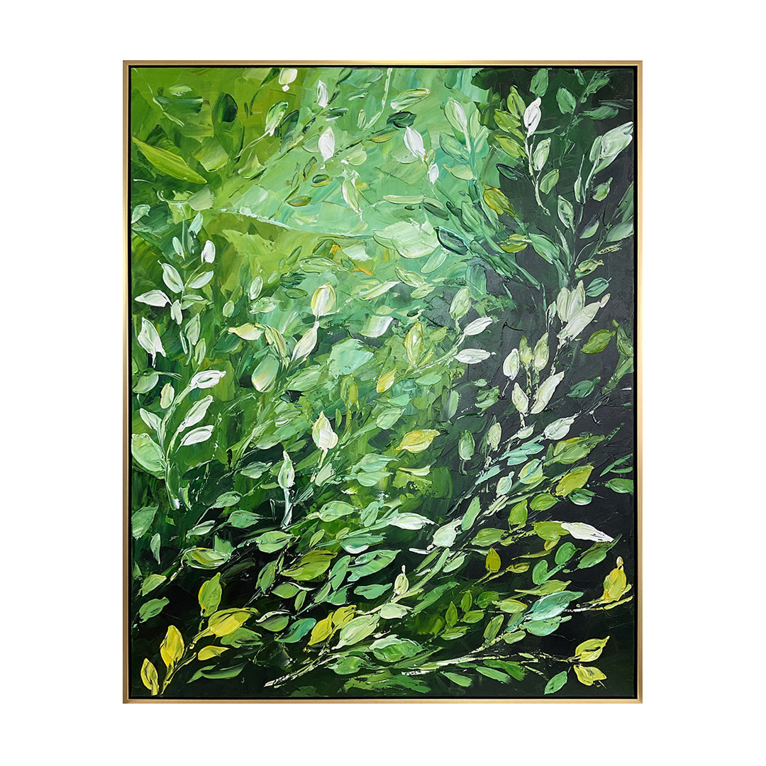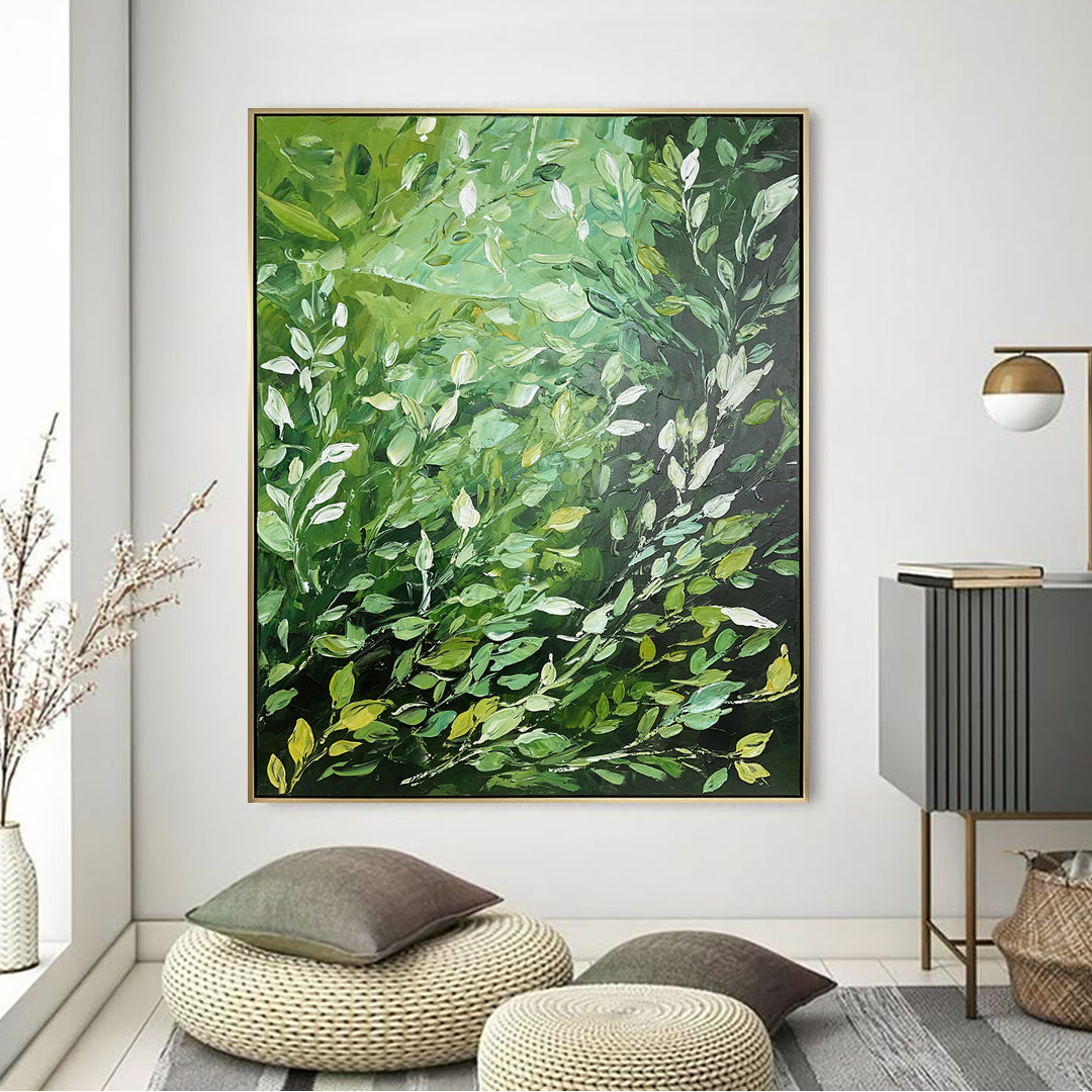 Lush, overlapping leaves unfurl in deep, vibrant greens, flowing like a gentle breeze through a secluded garden. A delicate balance of nature and artistry, this piece invites quiet contemplation, renewal, and serenity.