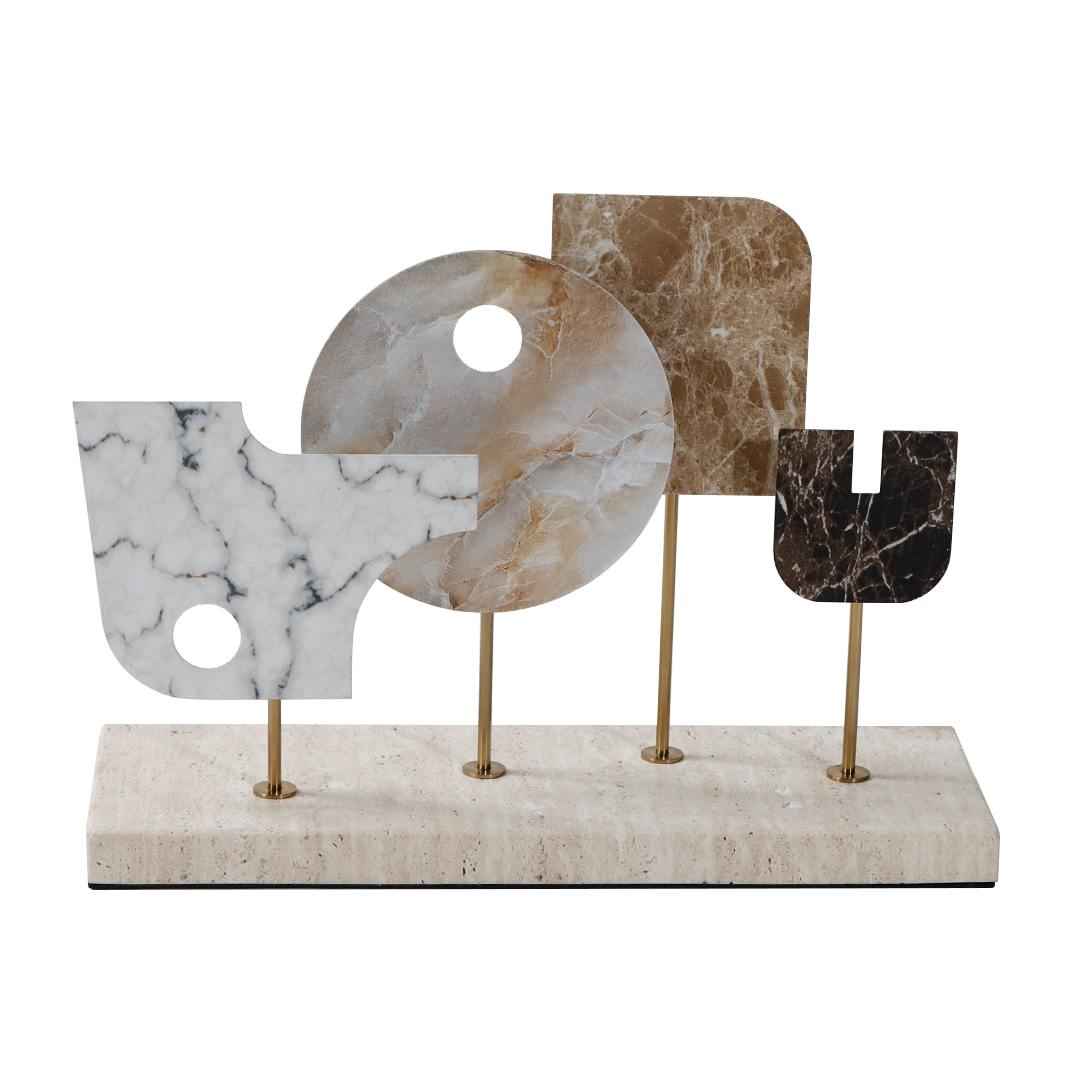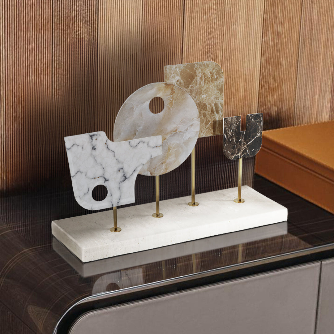 Four abstract geometric marble pieces, each uniquely veined and polished to showcase the natural beauty of the stone, delicately mounted atop golden stands. Truly a luxurious piece of art that adds a touch of opulence and seamlessly blends elegance with modern design.