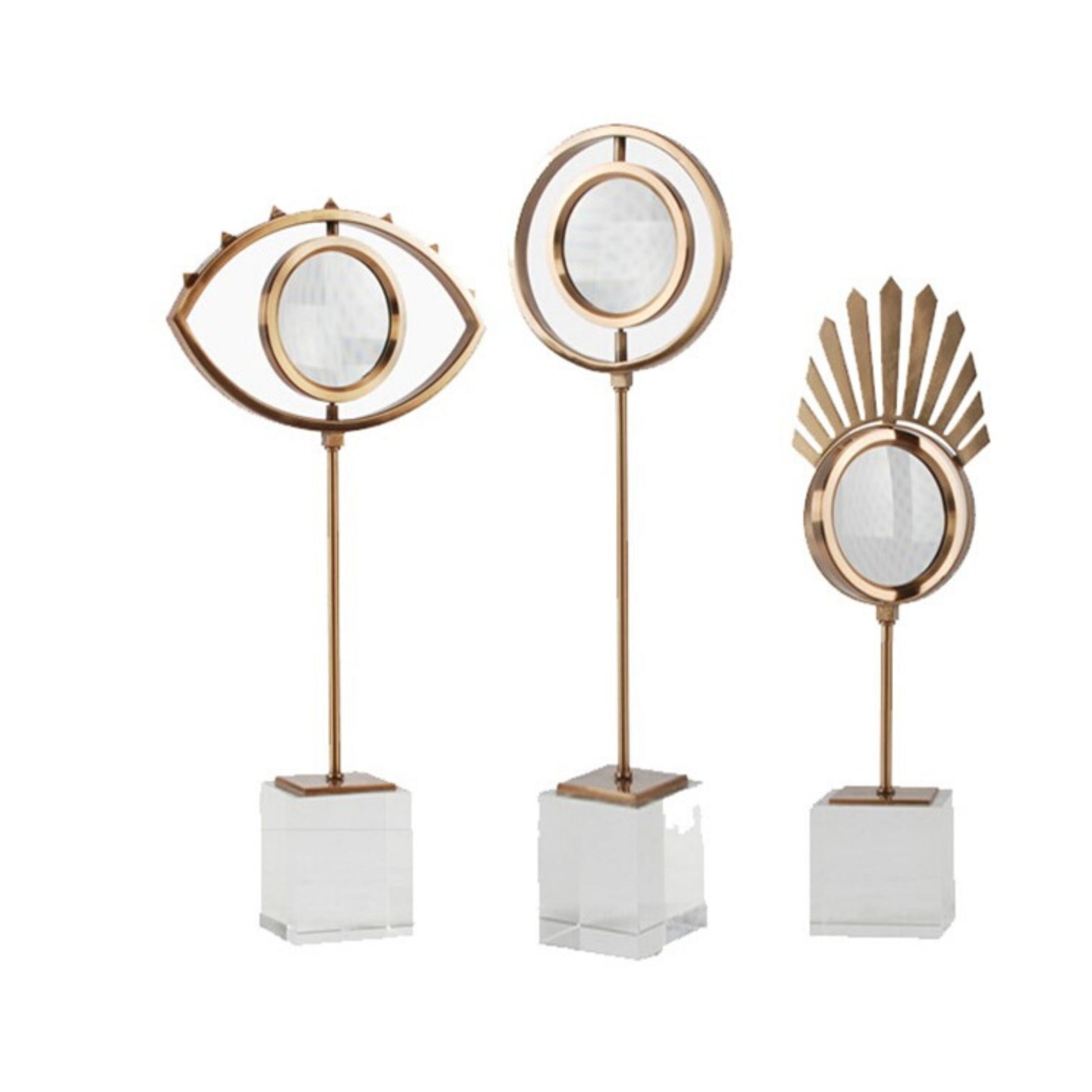 Crystal and iron make the perfect fusion of transparent and opaque. Display this statement piece by itself or in a set of 3 to make any home look more elegant. Available in 3 styles, each sold separately.