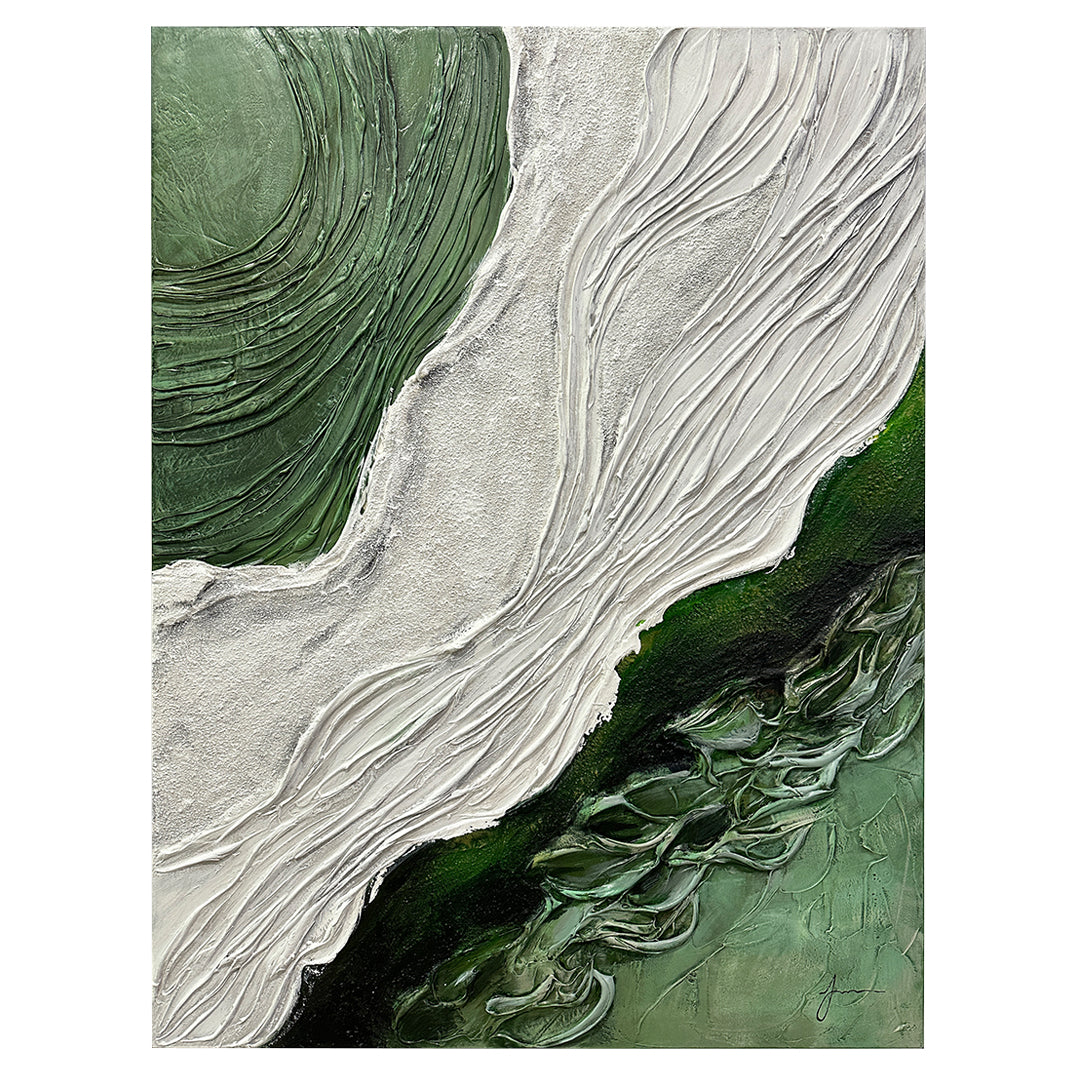Rich greens evoke the lushness of nature, symbolizing growth and the earth’s nurturing energy, while the contrasting white adds a harmonious balance of yin and yang, inspiring a stable and prosperous environment.