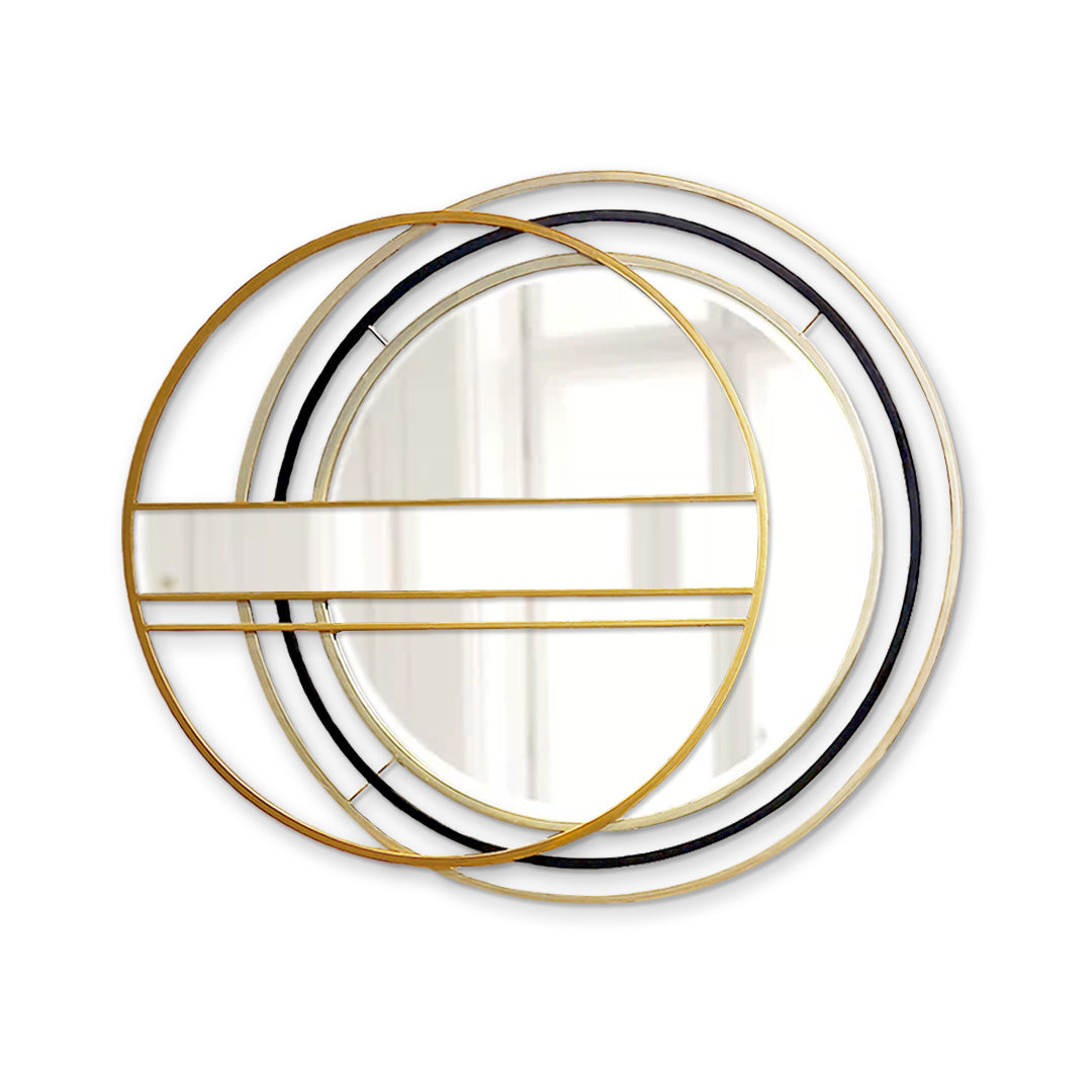 Enhance your décor with this elegant round mirror, characterized by a dynamic composition of gold rings and black outlines that bring a touch of glamour to your home.