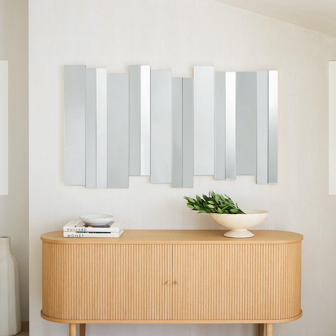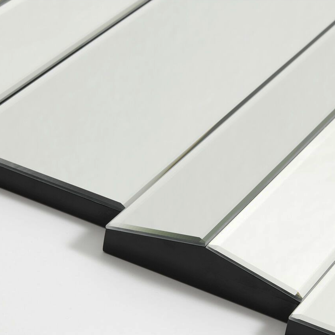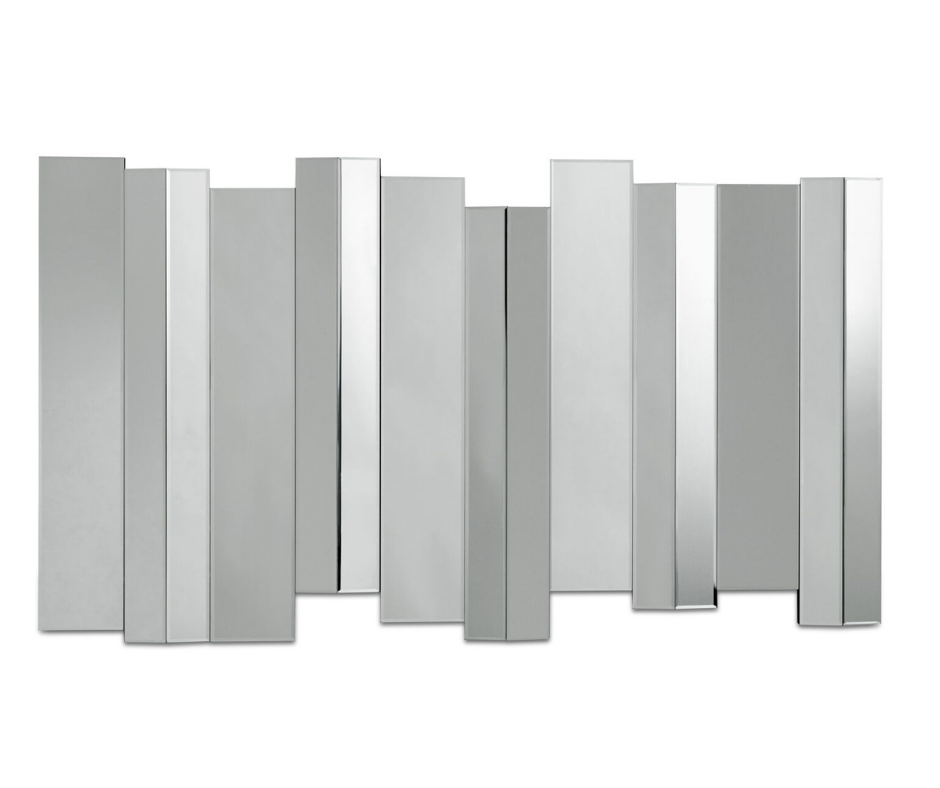 This unique, multi-faceted piece features asymmetrical vertical beveled mirrors lined together perfectly. May be hung on any wall in your home to not only enlarge the living space, but also bring sparkle much like a stunning work of art. Available in 3 colors - clear, bronze, or gray - to accent any room's interior.