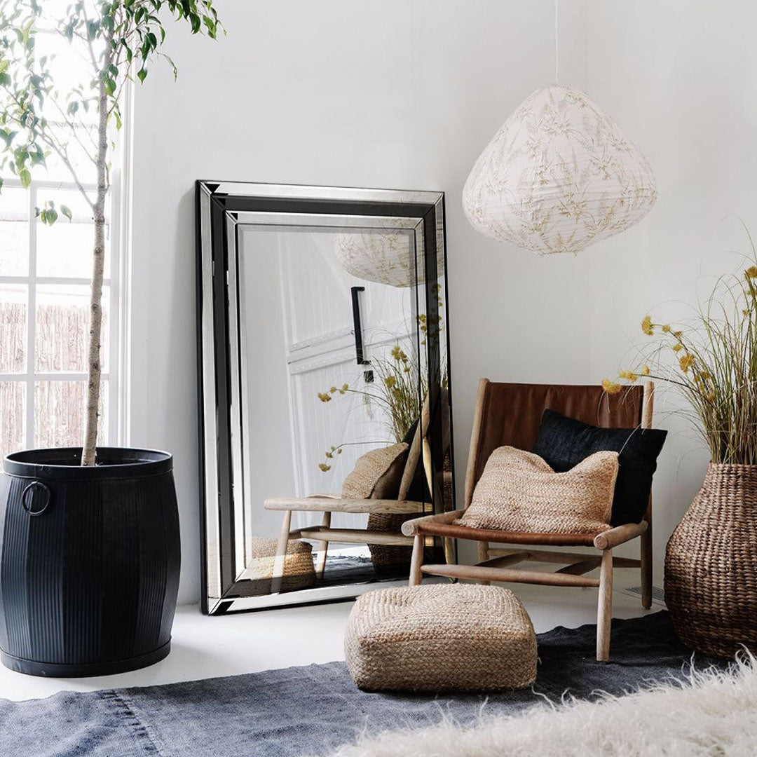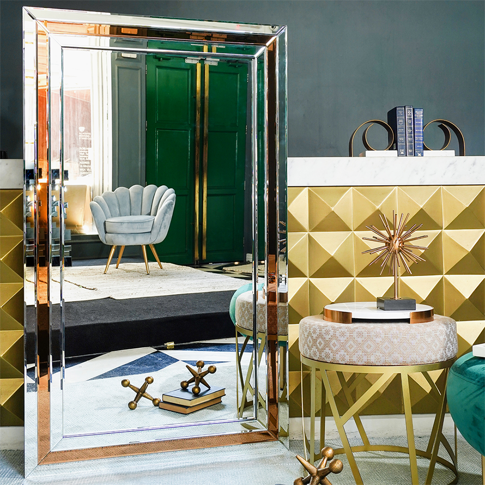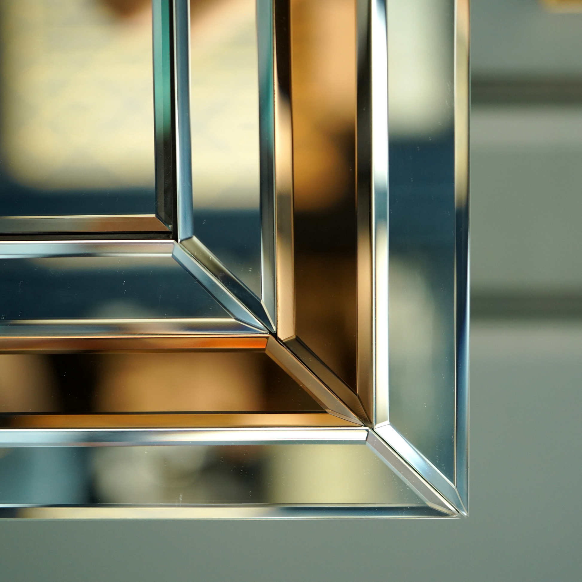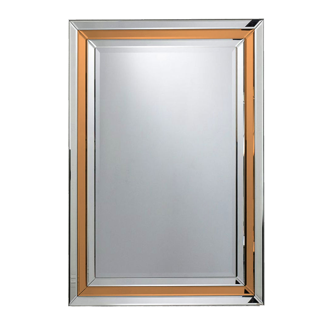 Simple in design yet refined in style, this piece is accented by a 3-layer beveled mirror frame and is complimented by a bronze mirror in between. The large size makes it perfect for enlarging the feel of a living space. May be set as a floor mirror, or hung horizontally or vertically on the wall.