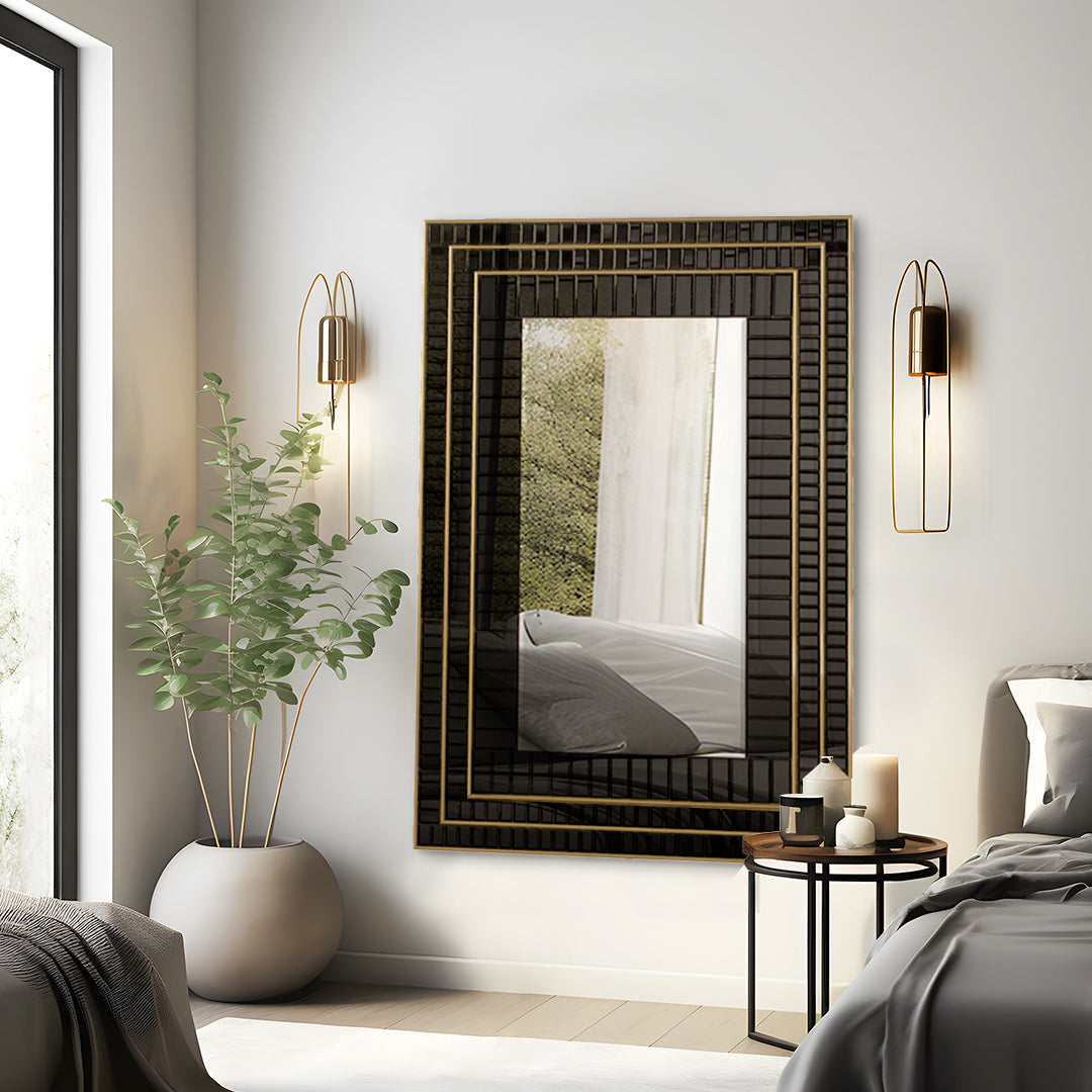 A touch of black to bring sophistication and opulence. The Kunwa mirror is a breathtaking statement piece featuring a frame made of an exquisite mosaic of small rectangular black-tinted mirrors, meticulously arranged to create a masterpiece of elegance.