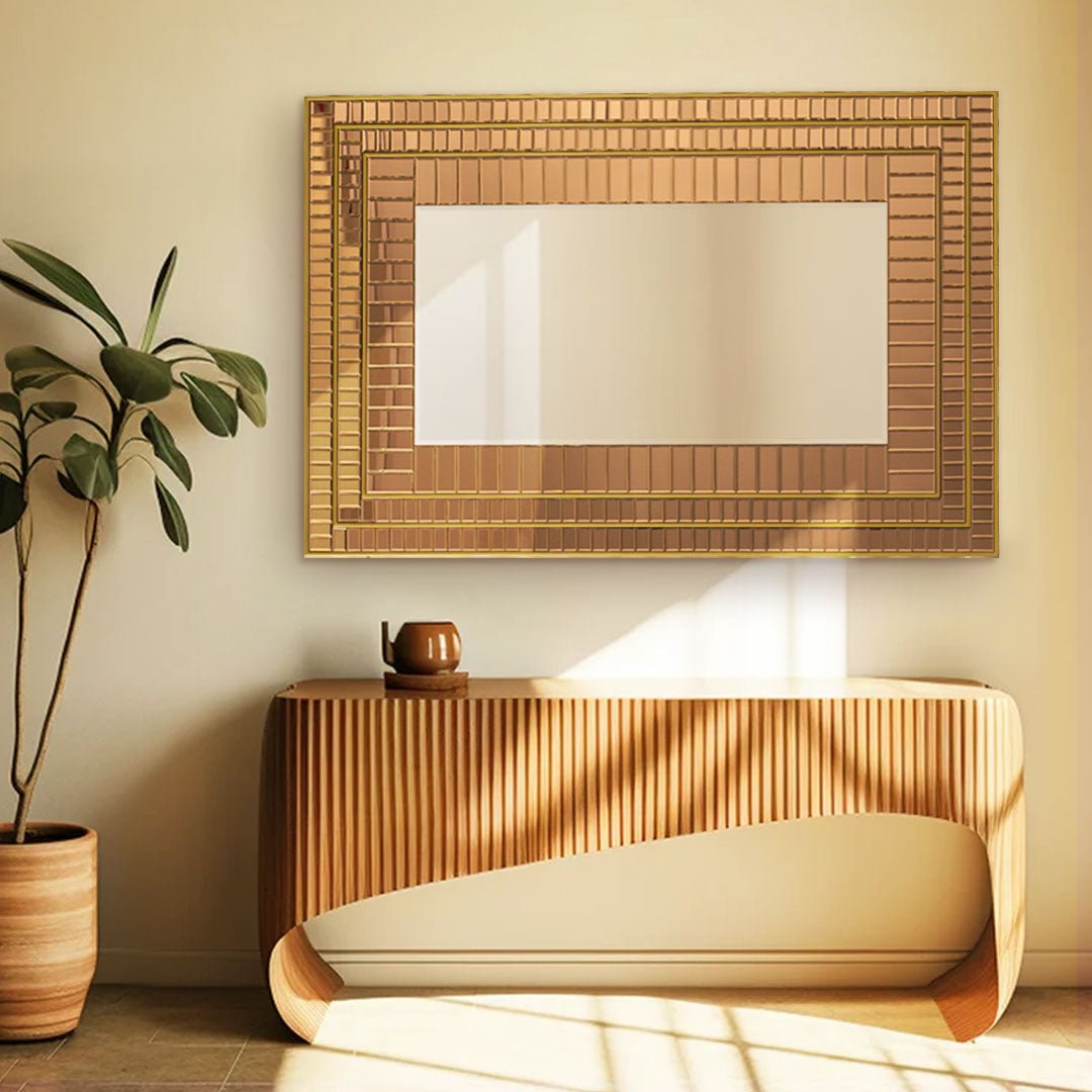 A touch of bronze to bring warmth and radiance. The Kunwa mirror is a breathtaking statement piece featuring a frame made of an exquisite mosaic of small rectangular bronze-tinted mirrors, meticulously arranged to create a masterpiece of elegance.