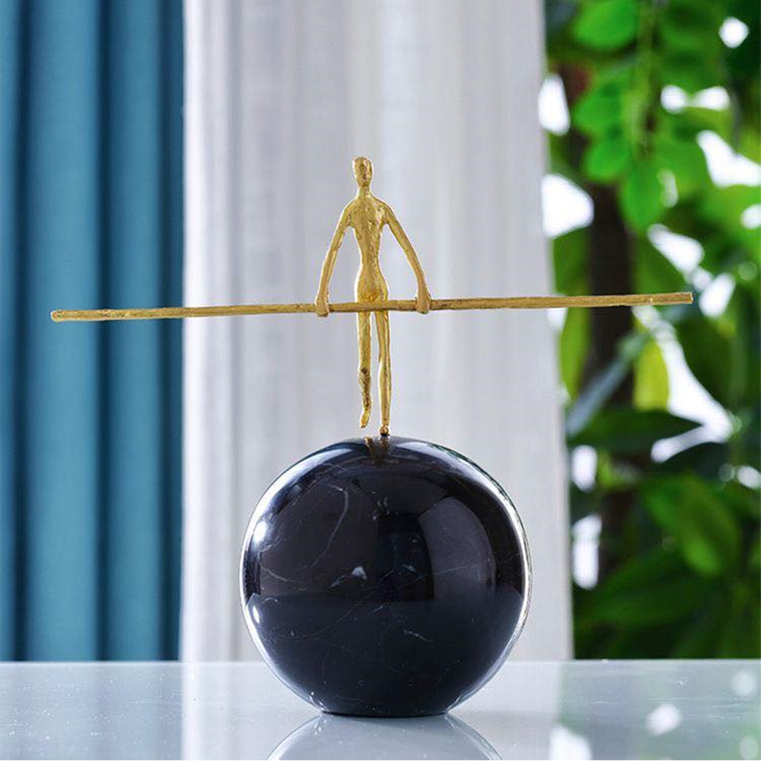 This mesmerizing piece of art embodies the essence of balance and strength, depicting a gold figure effortlessly lifting a long pole while balancing atop a large black sphere. A wonderful décor option for sport and fitness enthusiasts.
