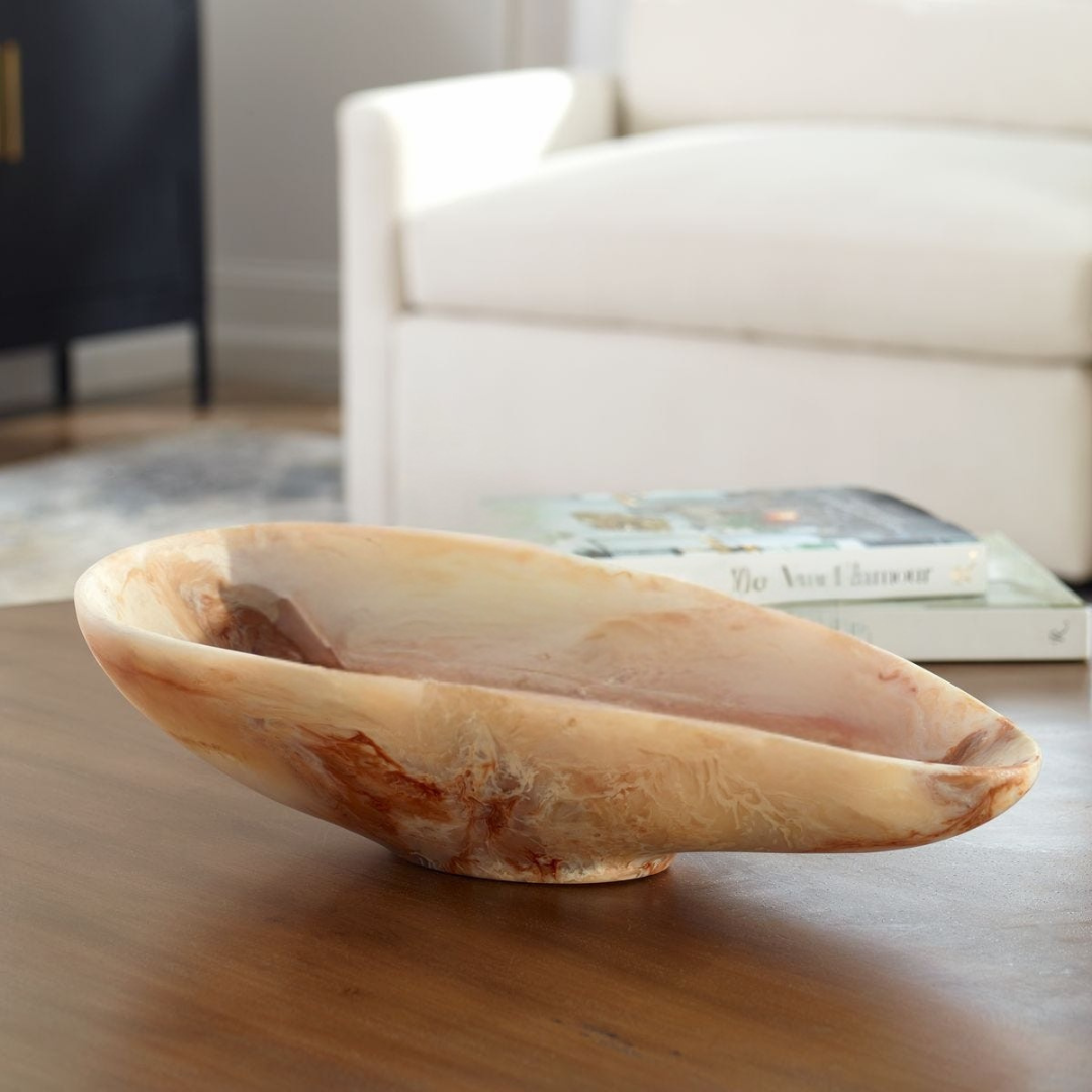 The beauty of the Marchena Bowl is its organic shape and marbleized finish. The caramel swirl finish consists of ivories, browns and tans all organically swirled together. Due to the handcrafted nature of this piece each item will vary.