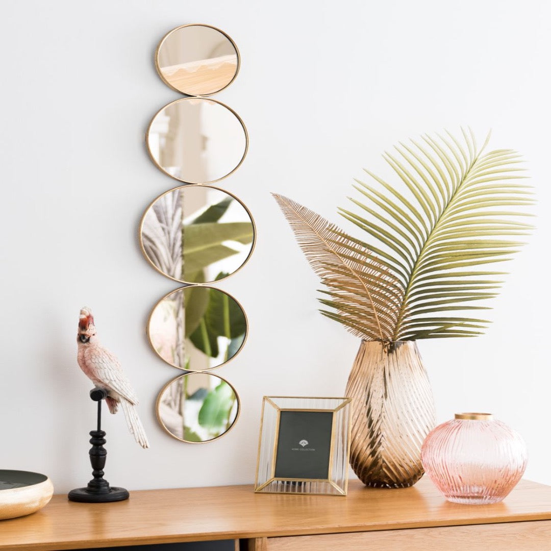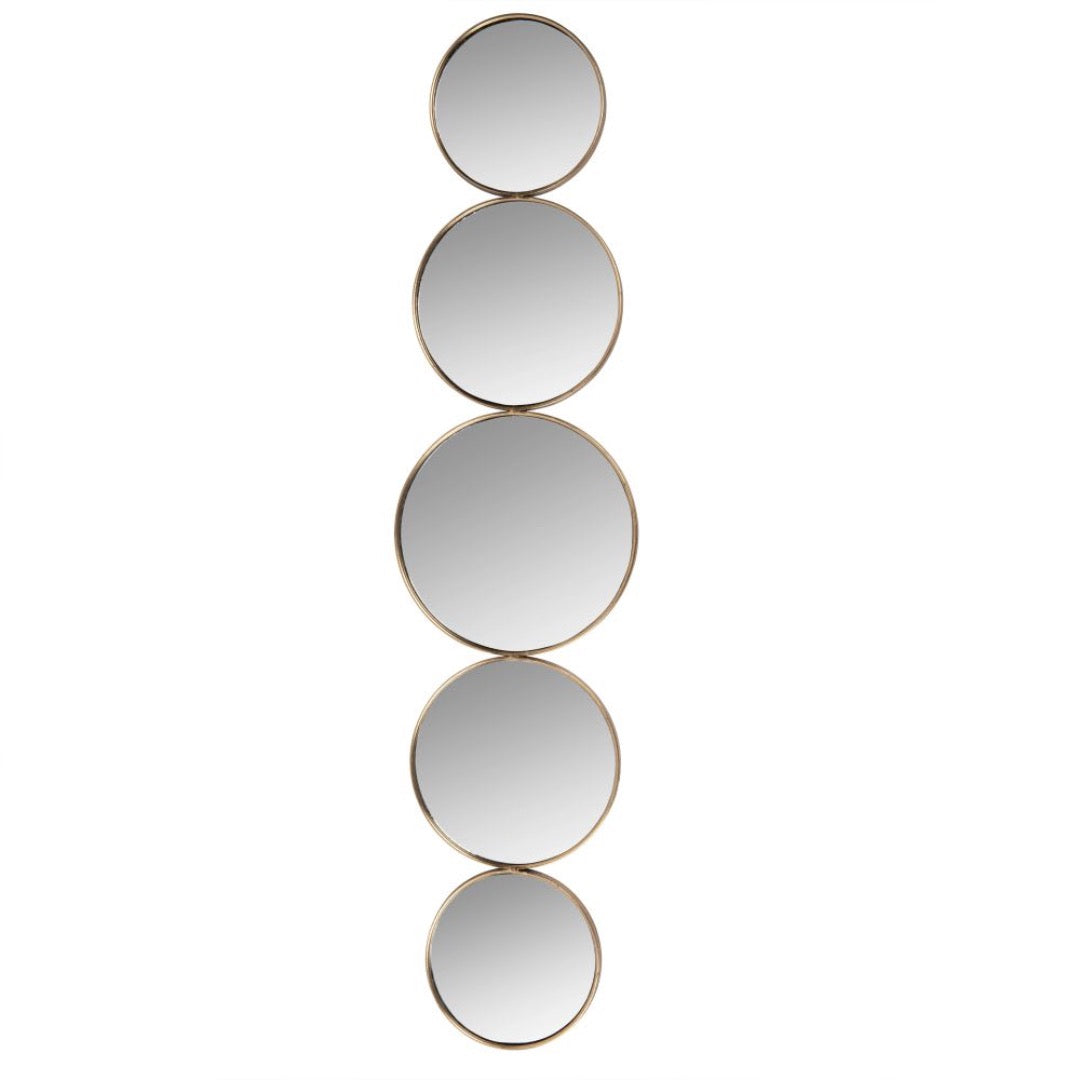 Looking for a perfect accent for your wall? This striking piece features a series of circular mirrors lined vertically. Crafted out of iron in a subdued shade of gold, this mirror will definitely spruce up your living space.