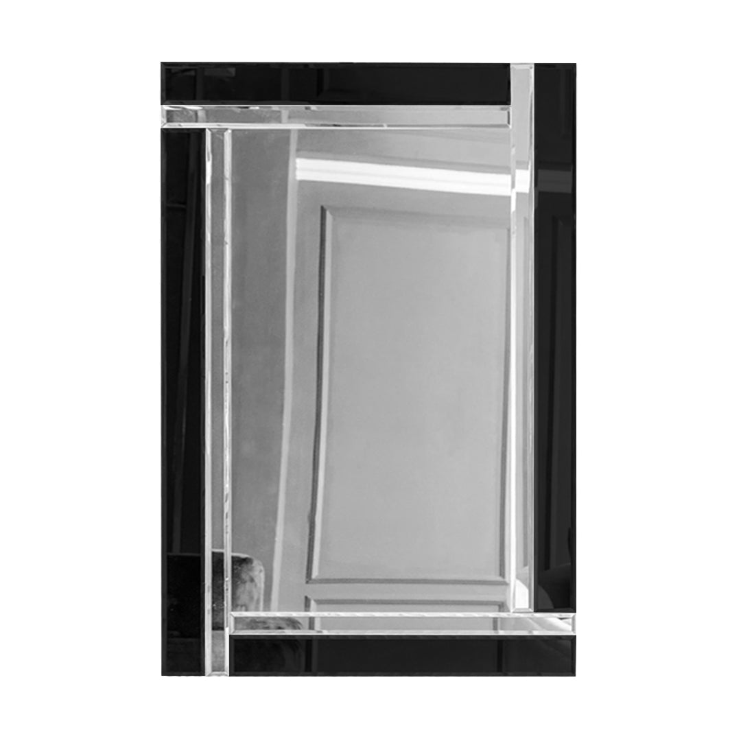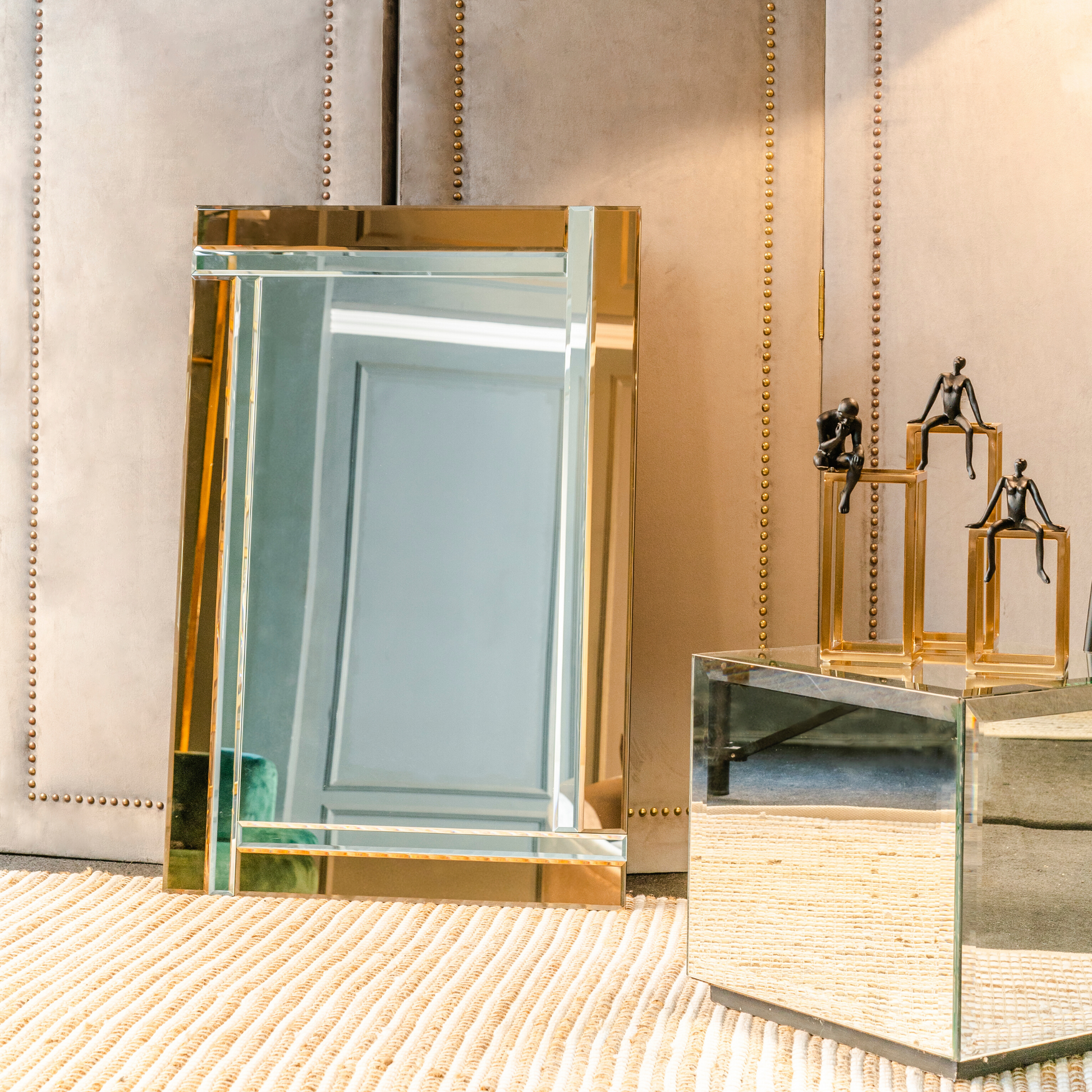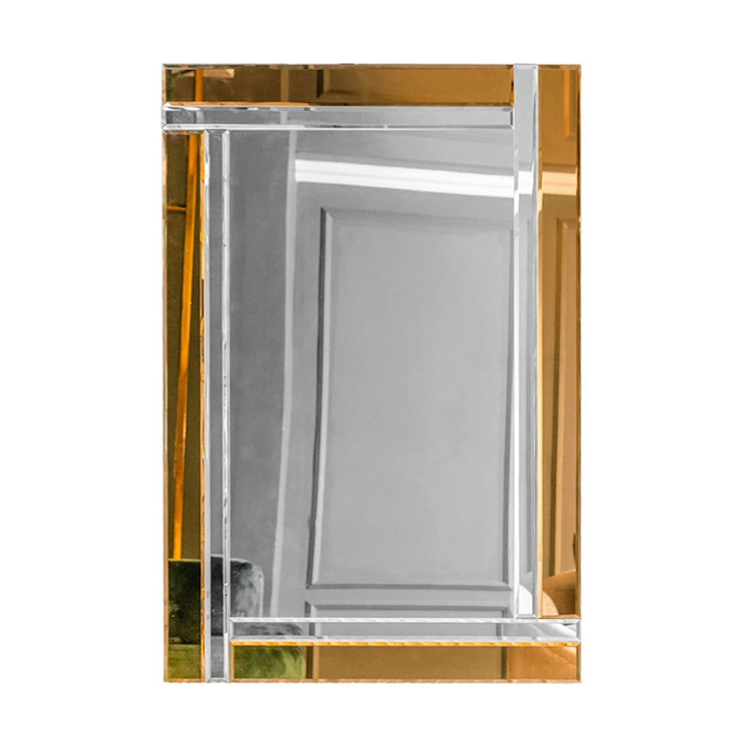 Simple in design yet refined in style, this piece is accented by a 2-layer beveled mirror frame and is complimented by alternating bronze mirror edges. The small size makes it perfect for compact living spaces. May be hung horizontal or vertical.
