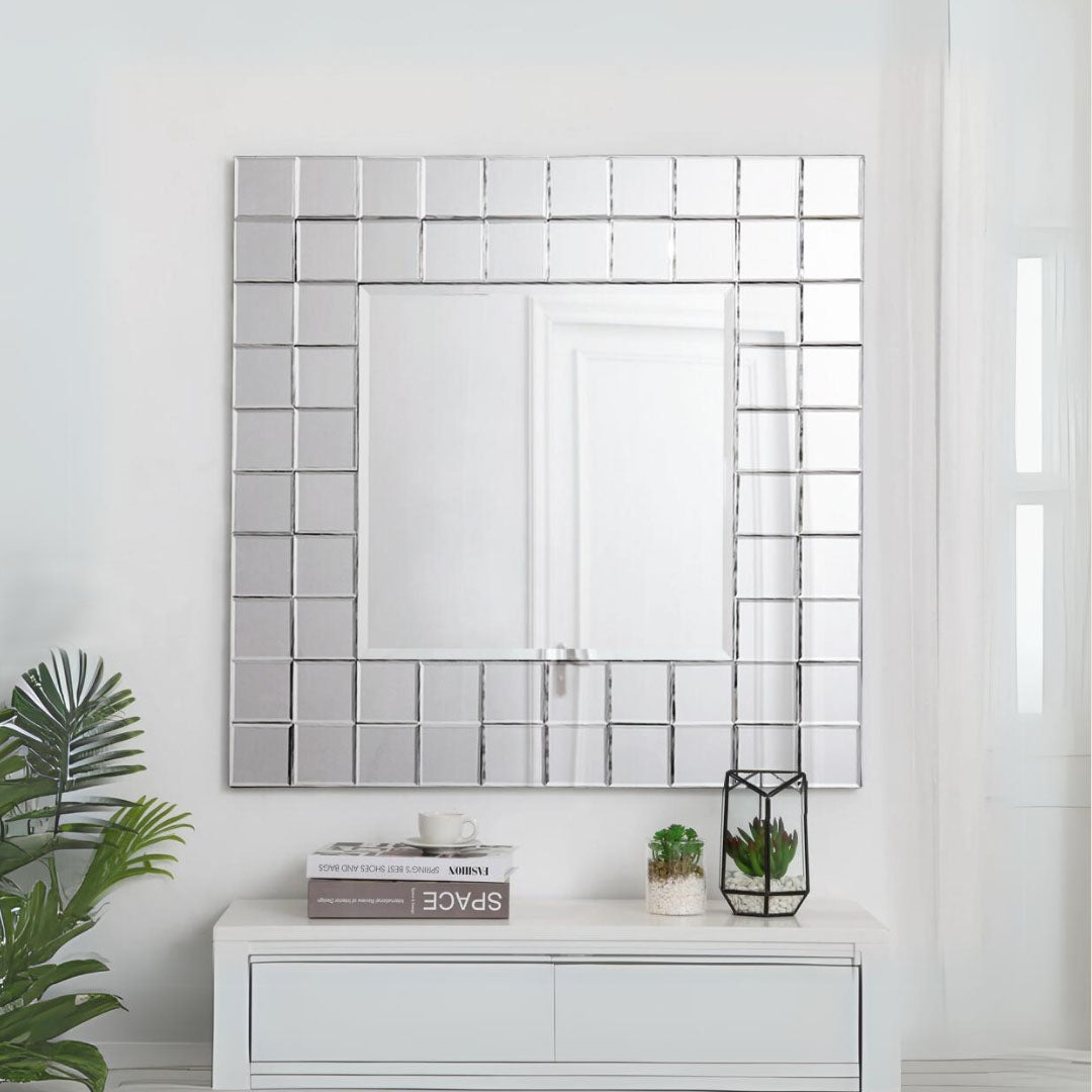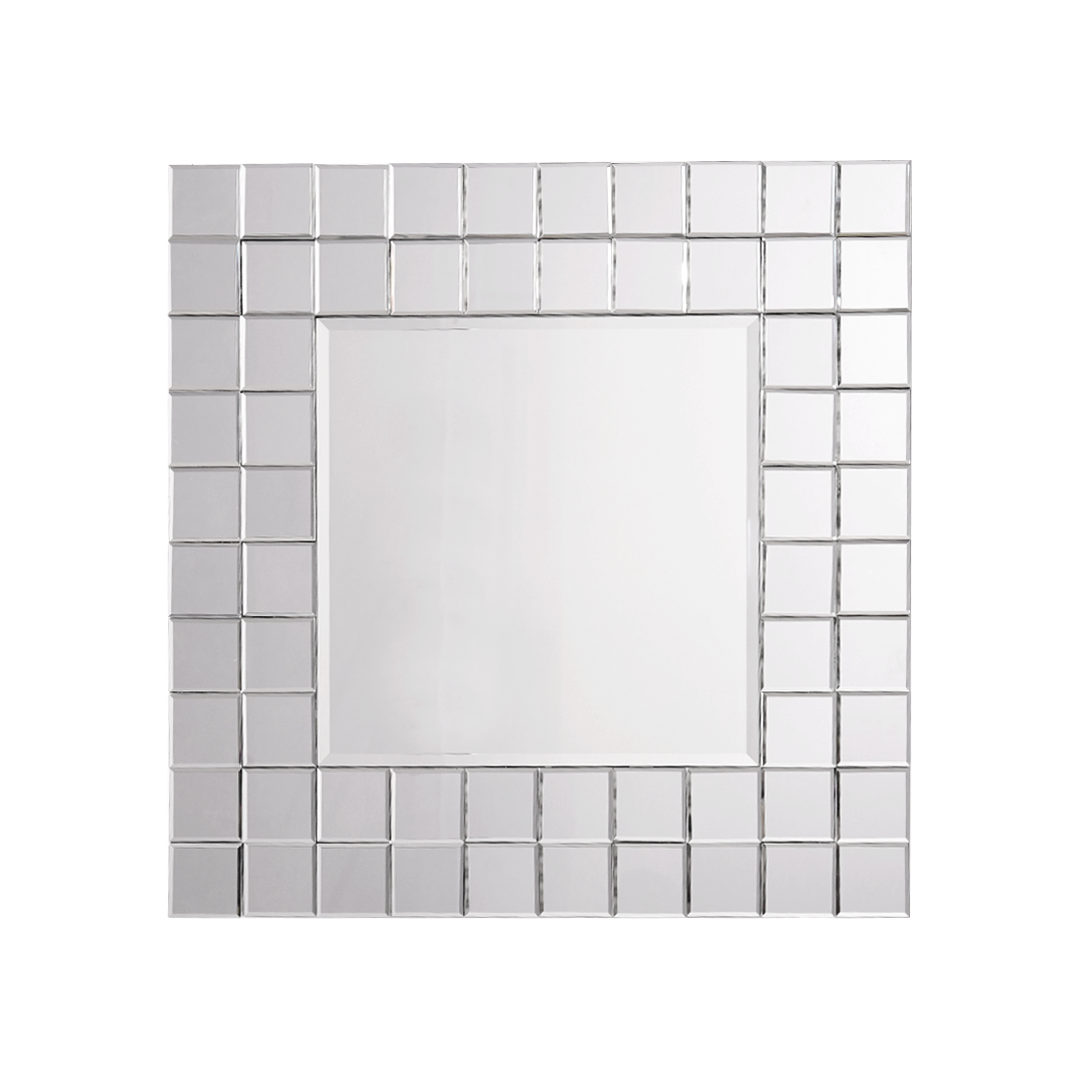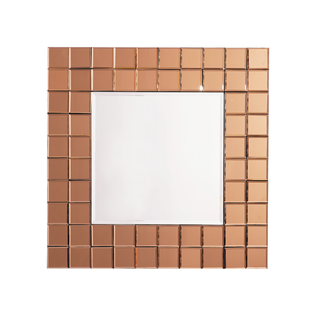 Double the glamour with the Mikaela mirror, featuring a grid frame of gleaming square mirrors. Available in clear or bronze.