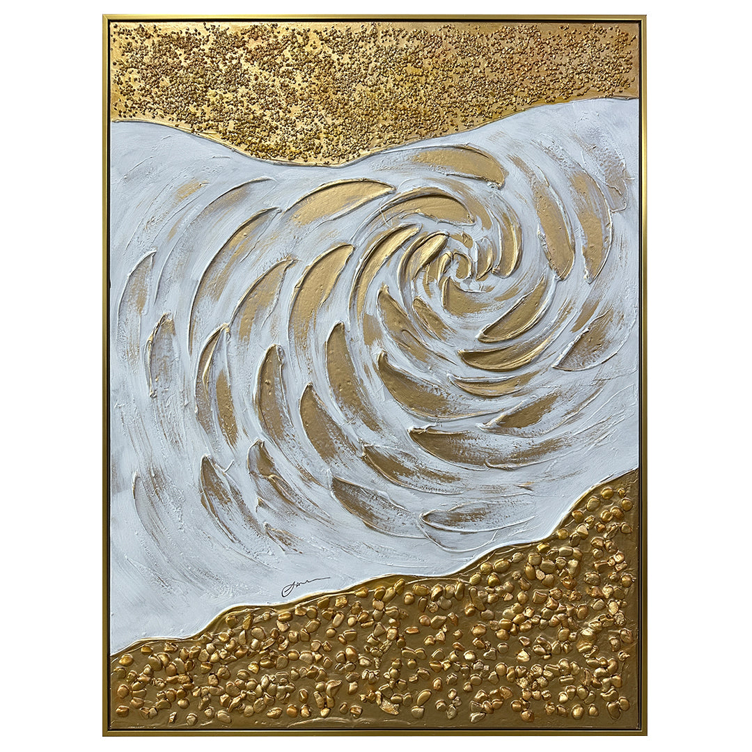 Like flecks of sunlight, these golden koi fishes swirl in a dance of prosperity within a pool of white. The circular motion, a direction of good fortune, paints the canvas with success that is more than enough.