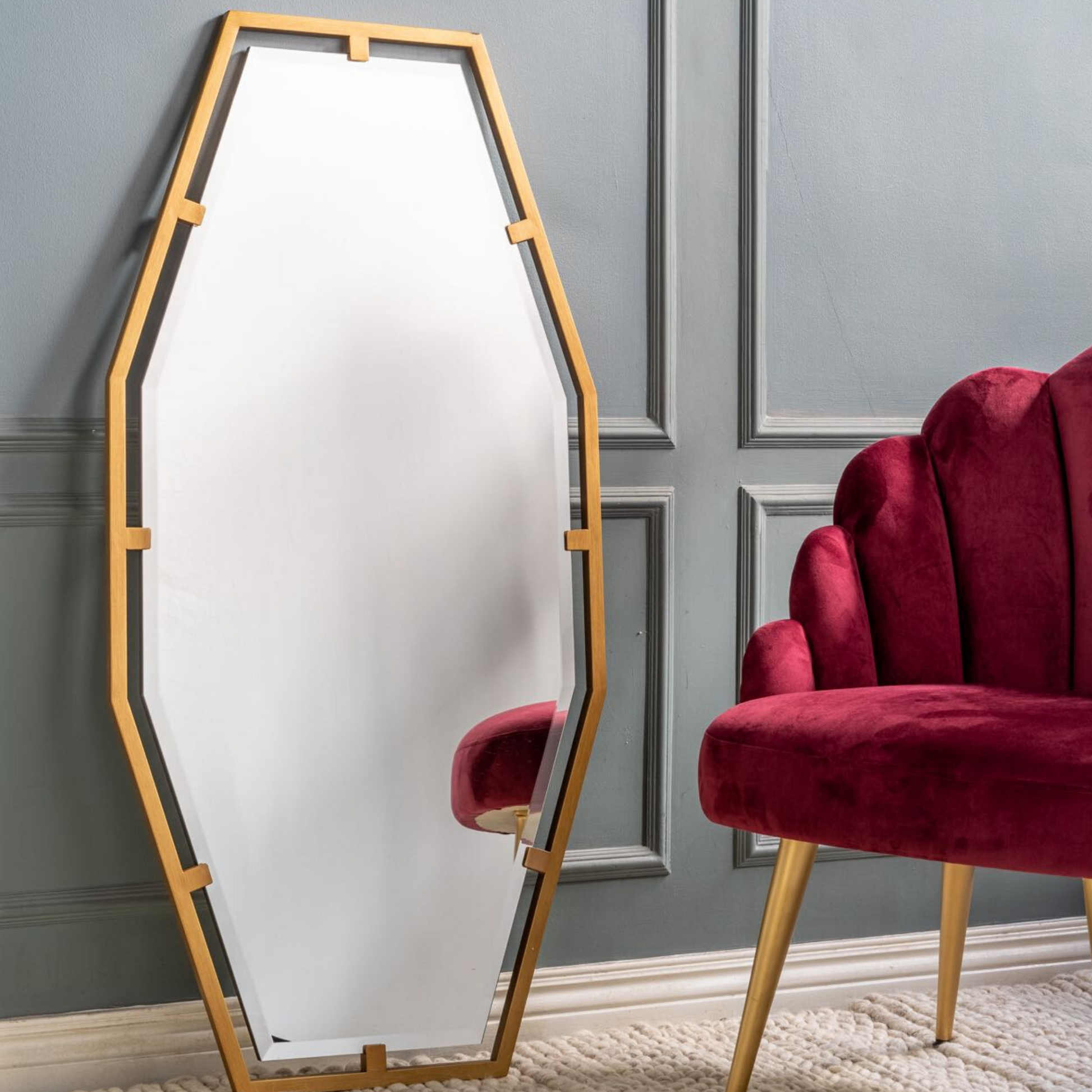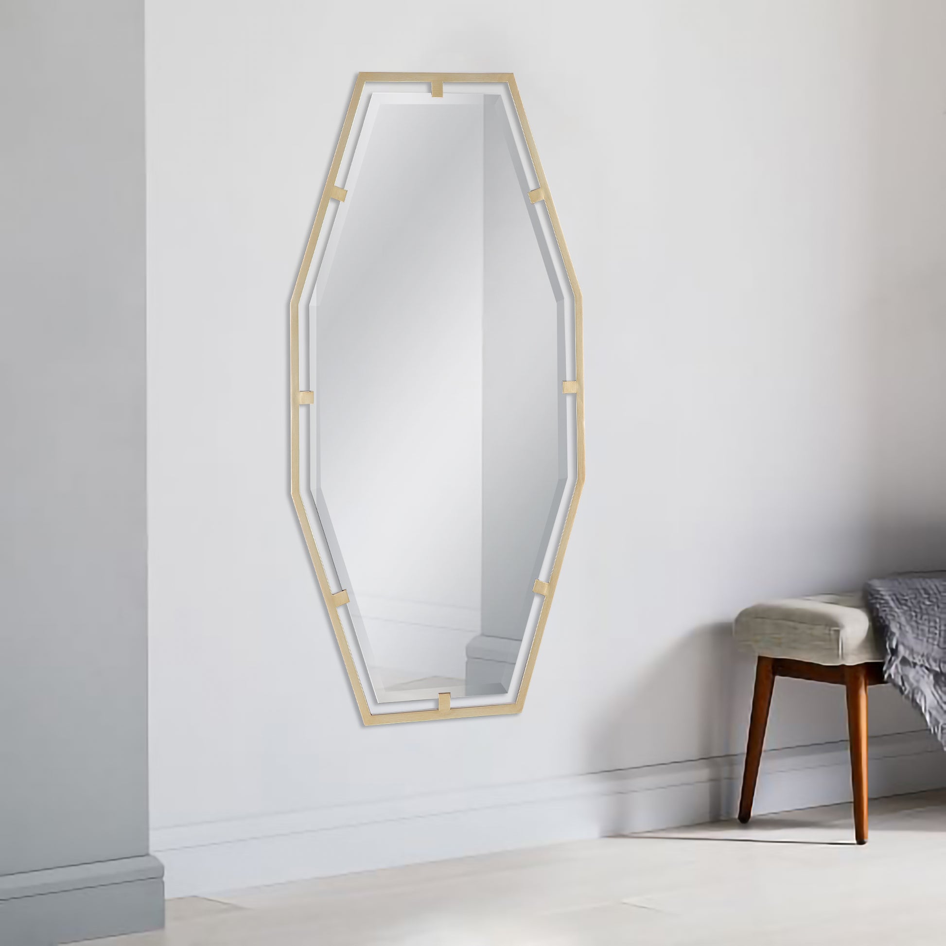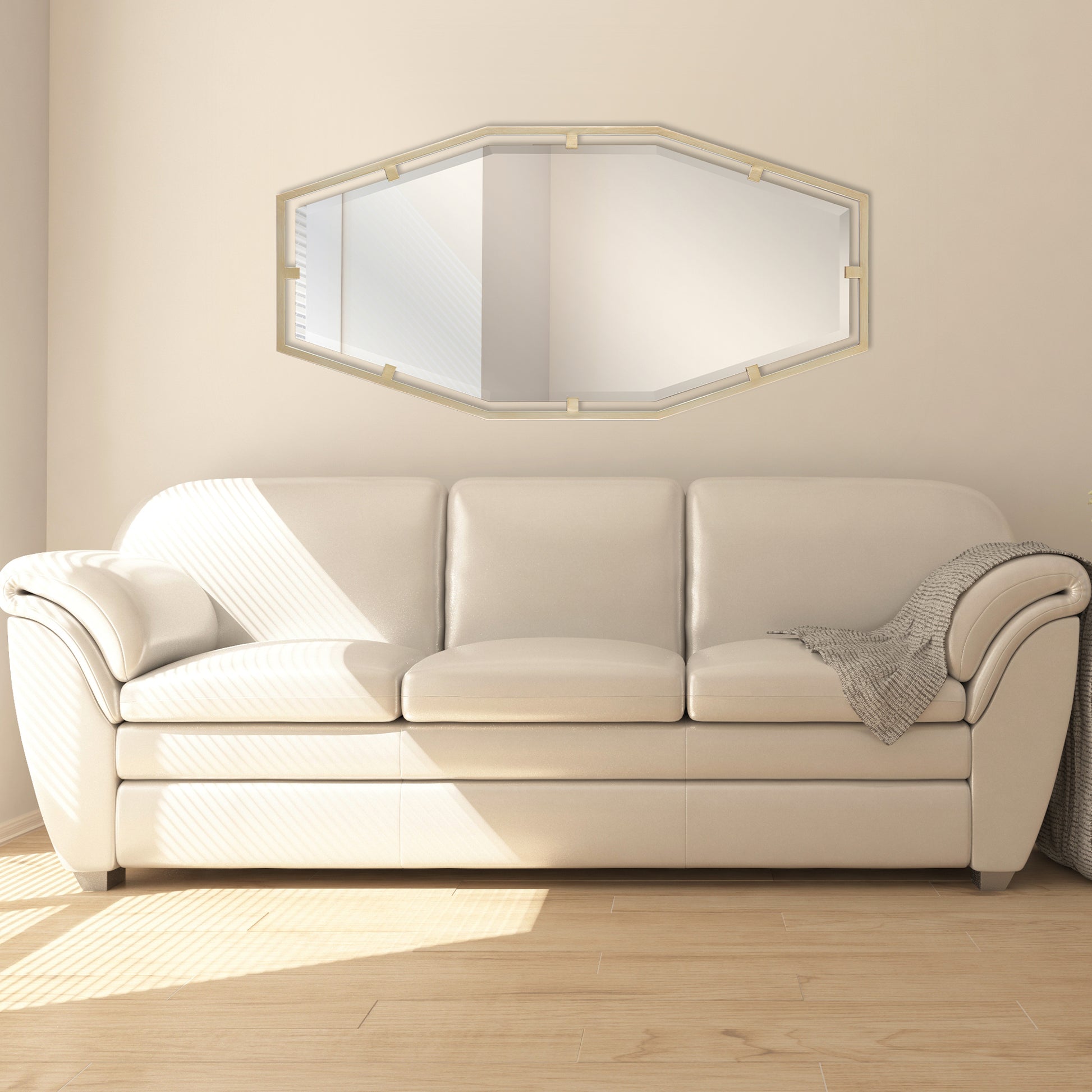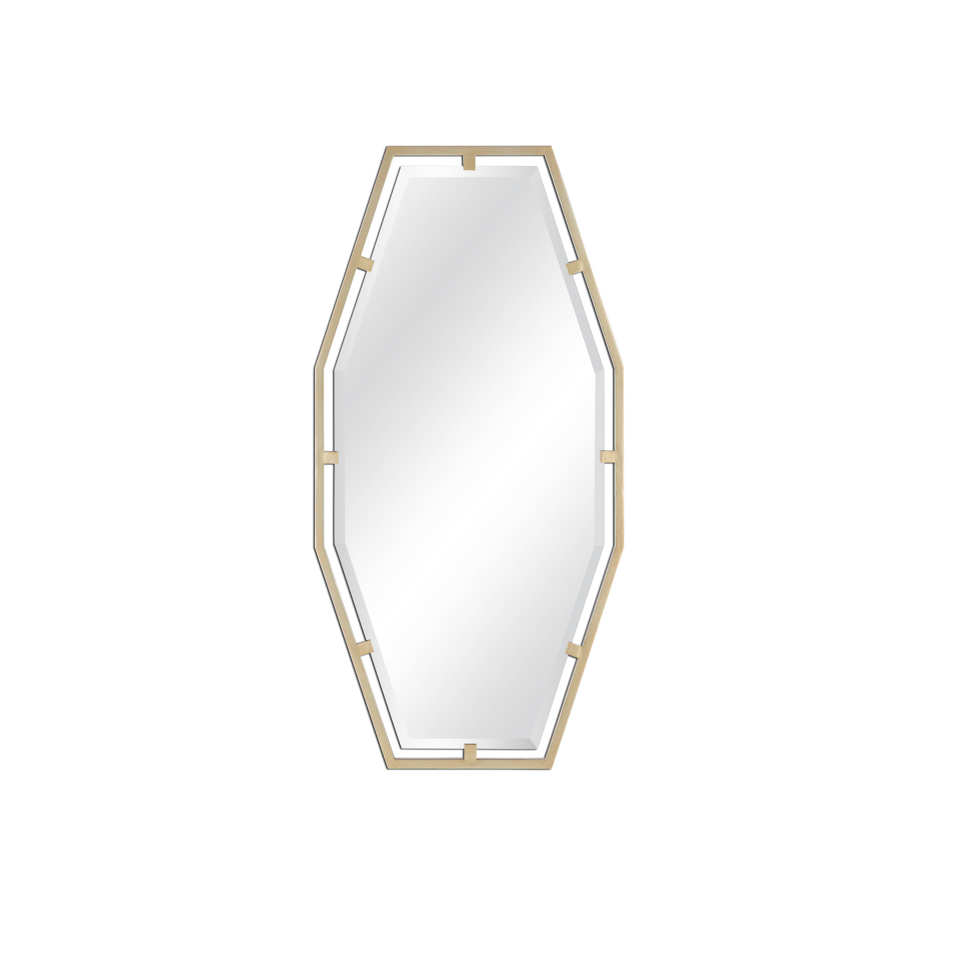 This octagonal design features a solid metallic frame, finished in a champagne gold hue, showcasing antique mirror inlays. The mirror features a simple 1/2" bevel around the edges, nestled in a metallic frame attachment on four sides. May be hung horizontal or vertical.