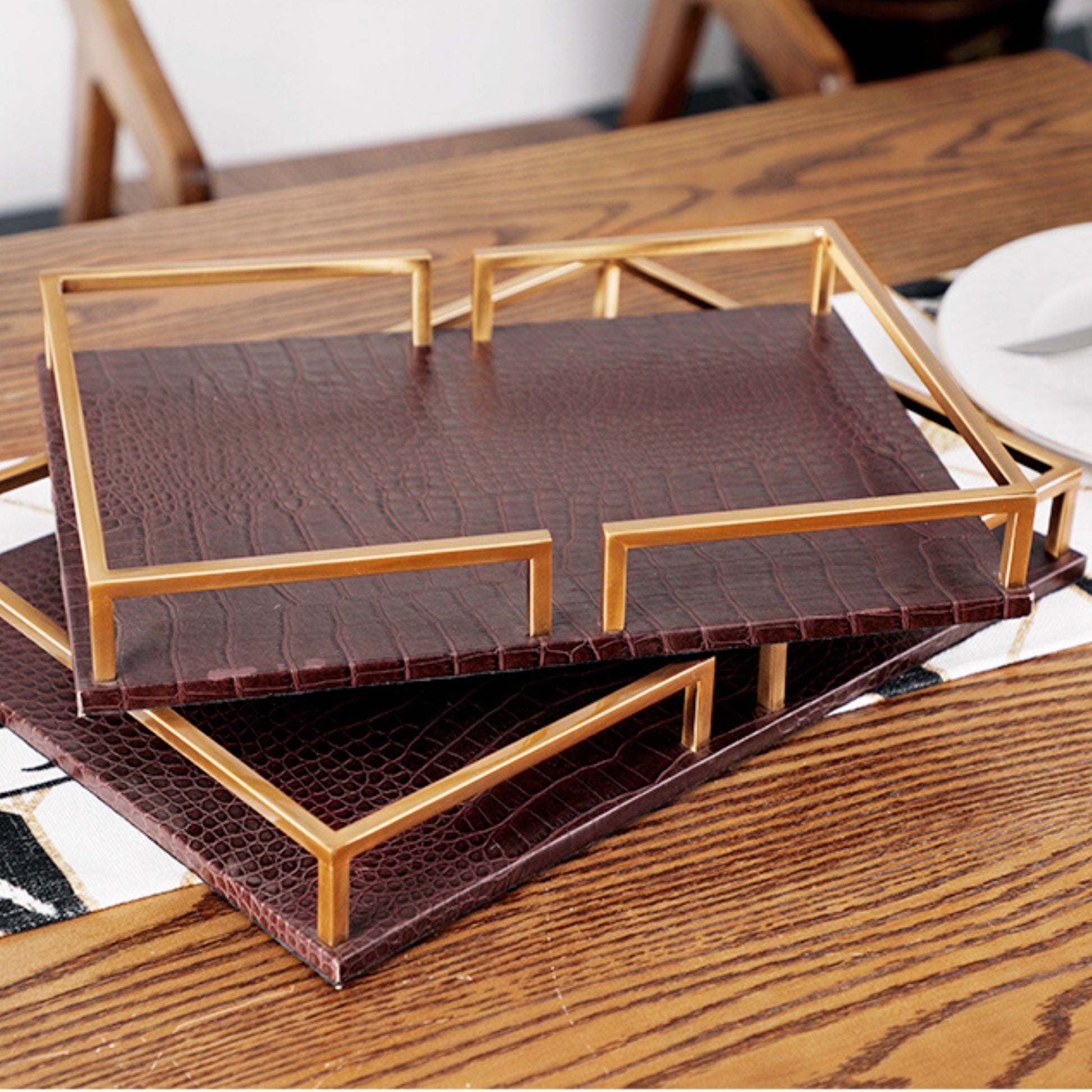 This stylish decorative tray is crafted from gold iron and faux leather trim to blend with any interior design. Perfect as a table top decor, a way to organize desk clutter, or for serving and entertaining guests. Comes in 2 sizes and 2 colors.