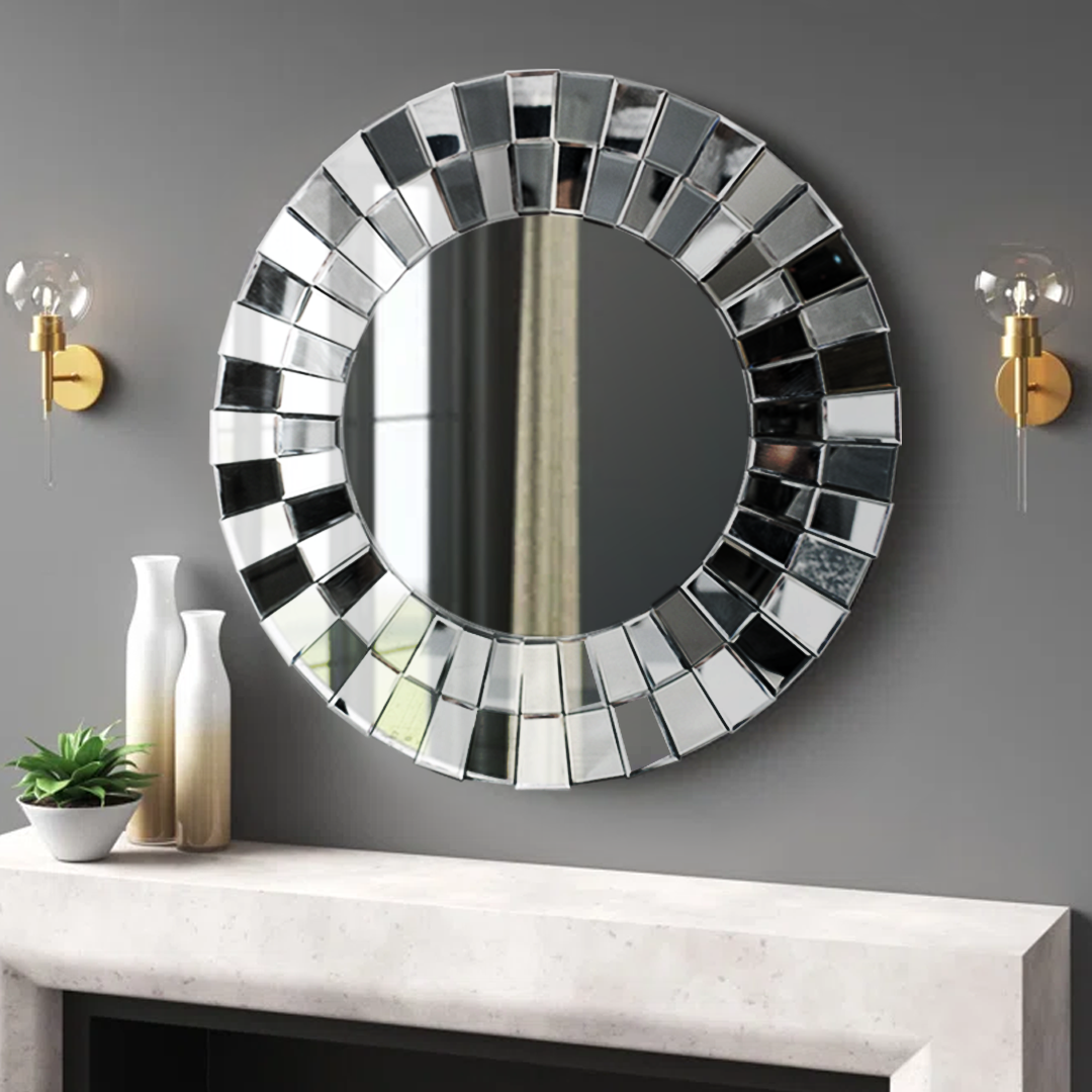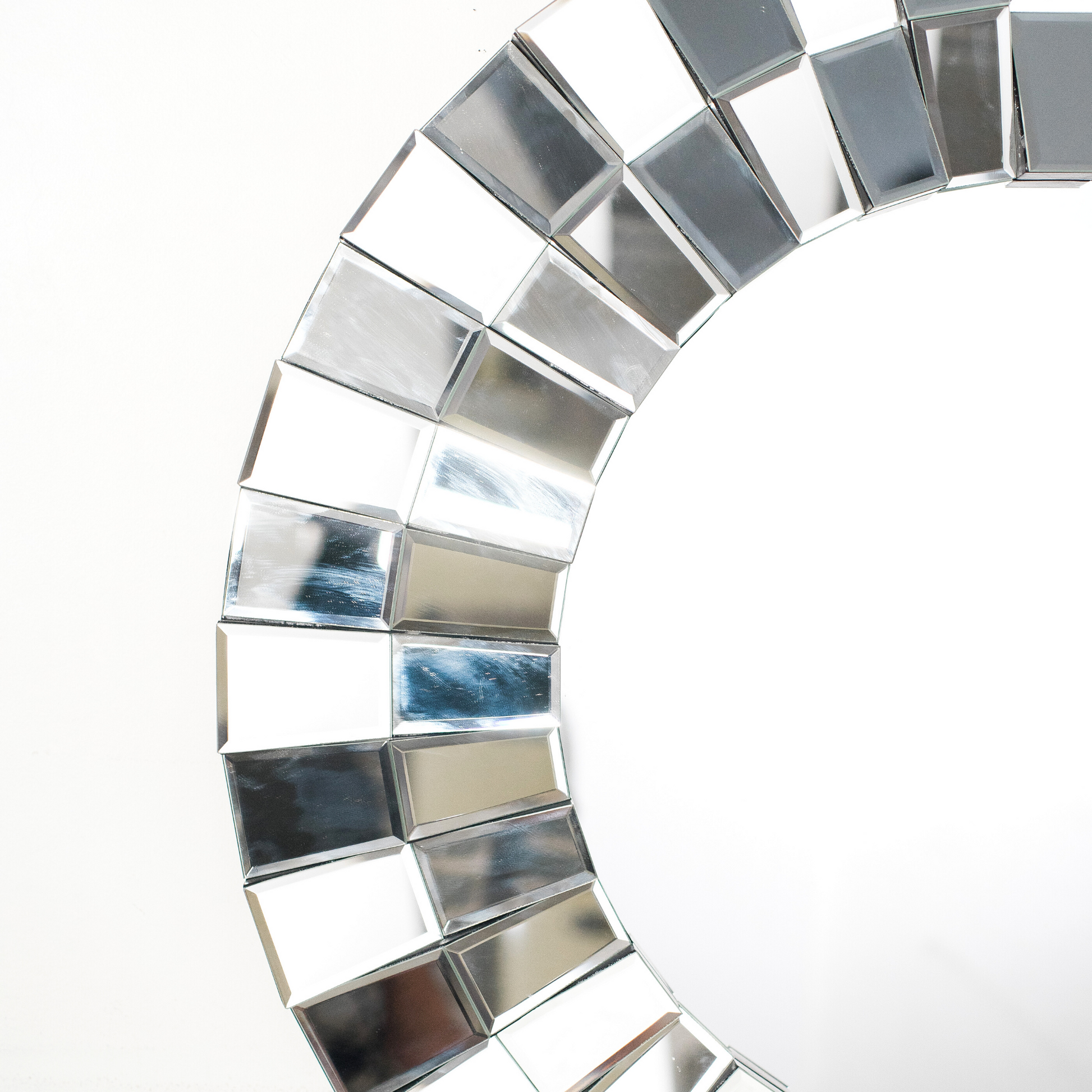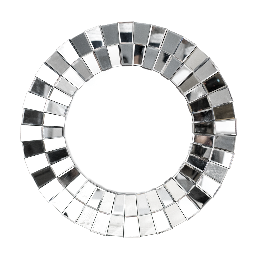 A contemporary bevelled mirror, the outer border being made of individually bevelled mirror panels. Each panel is set at a different angle to the next, creating a multitude of different reflections for a timeless.