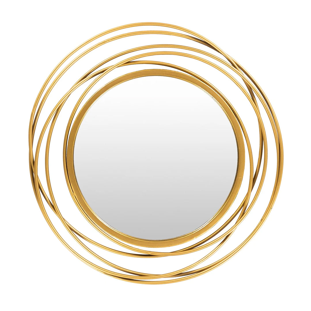 Embrace contemporary luxury with this round mirror, framed in gleaming gold metal featuring an intricate woven wire design. Its radiant reflection and eye-catching aesthetic make it a must-have statement piece, elevating any space with its undeniable charm and elegance.
