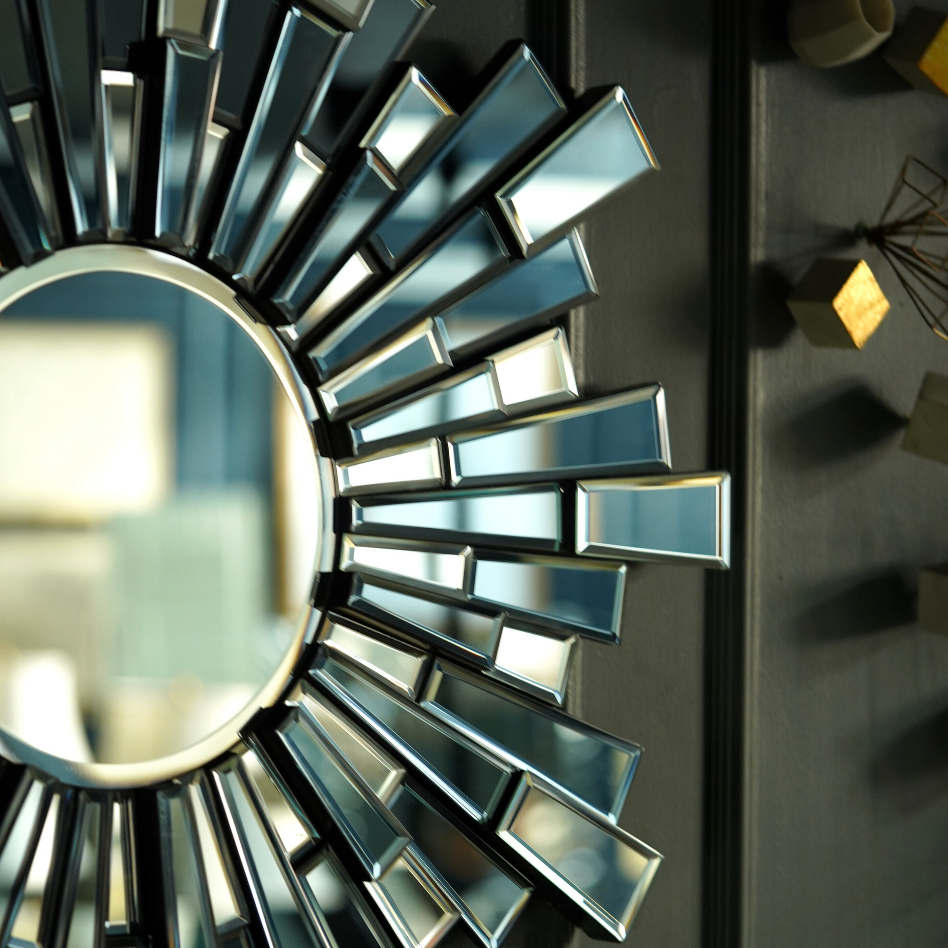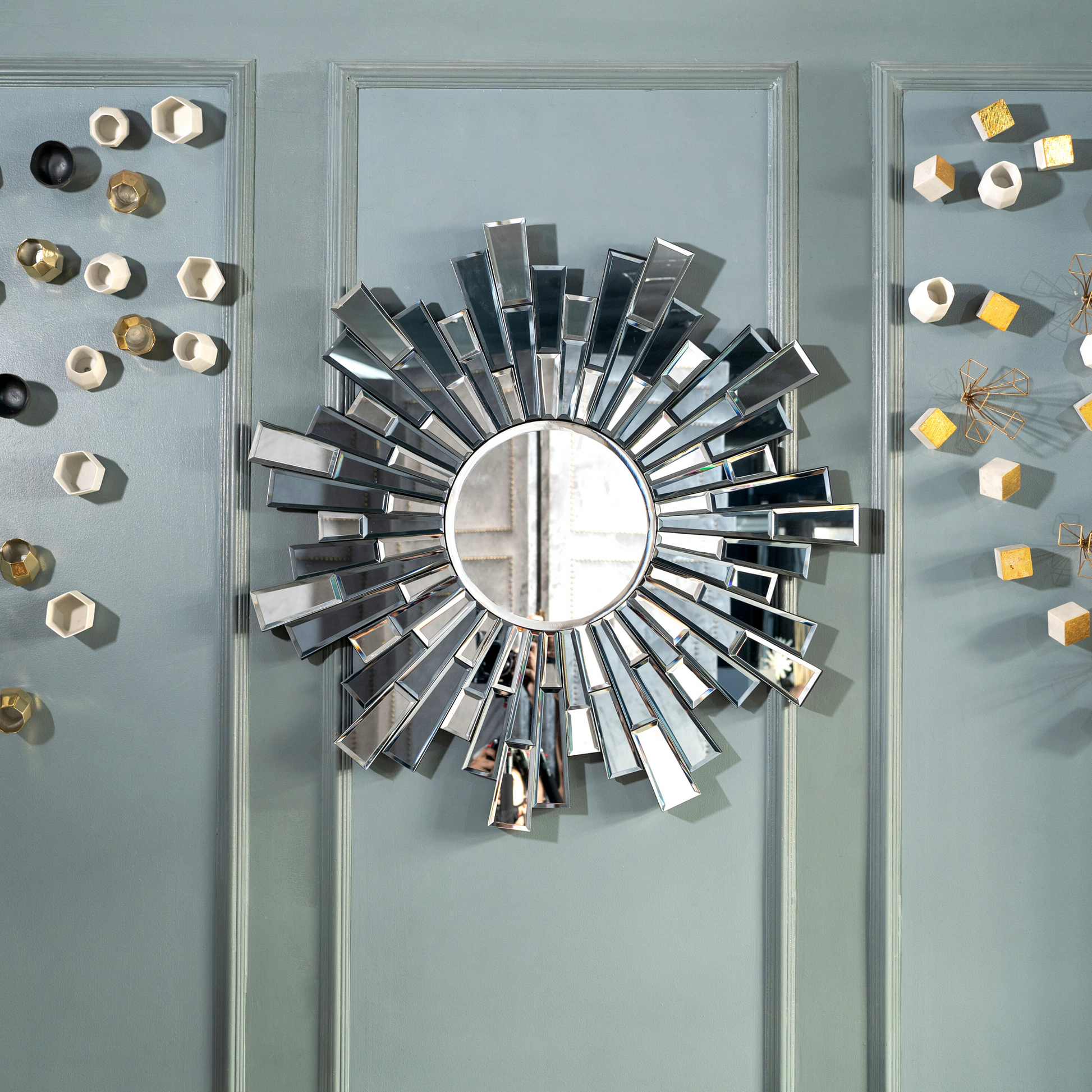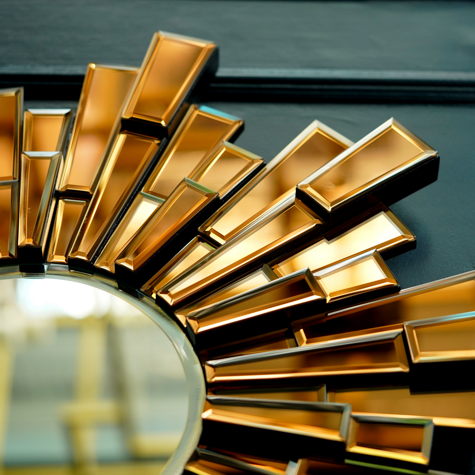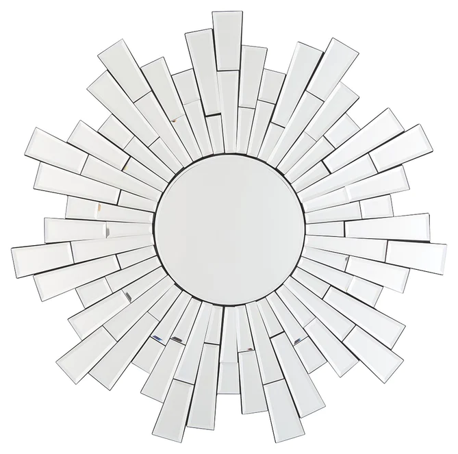 Bring some sunshine into your living space with this sunburst mirror in clear, bronze, or gray. The bevelled mirrors are set at different heights to create a 3D facet design for a multidimensional look and feel that will be perfect for any living space.