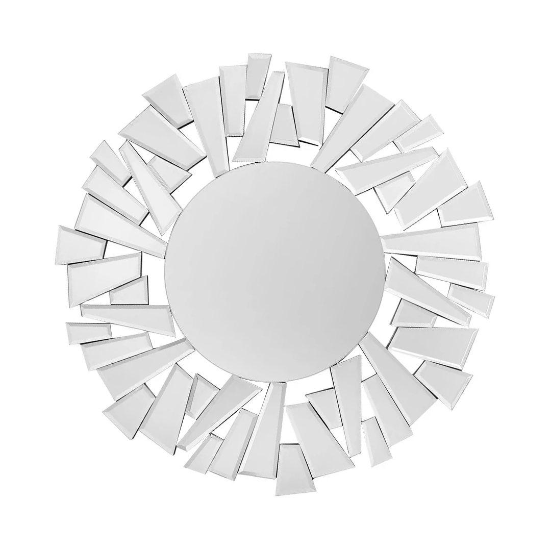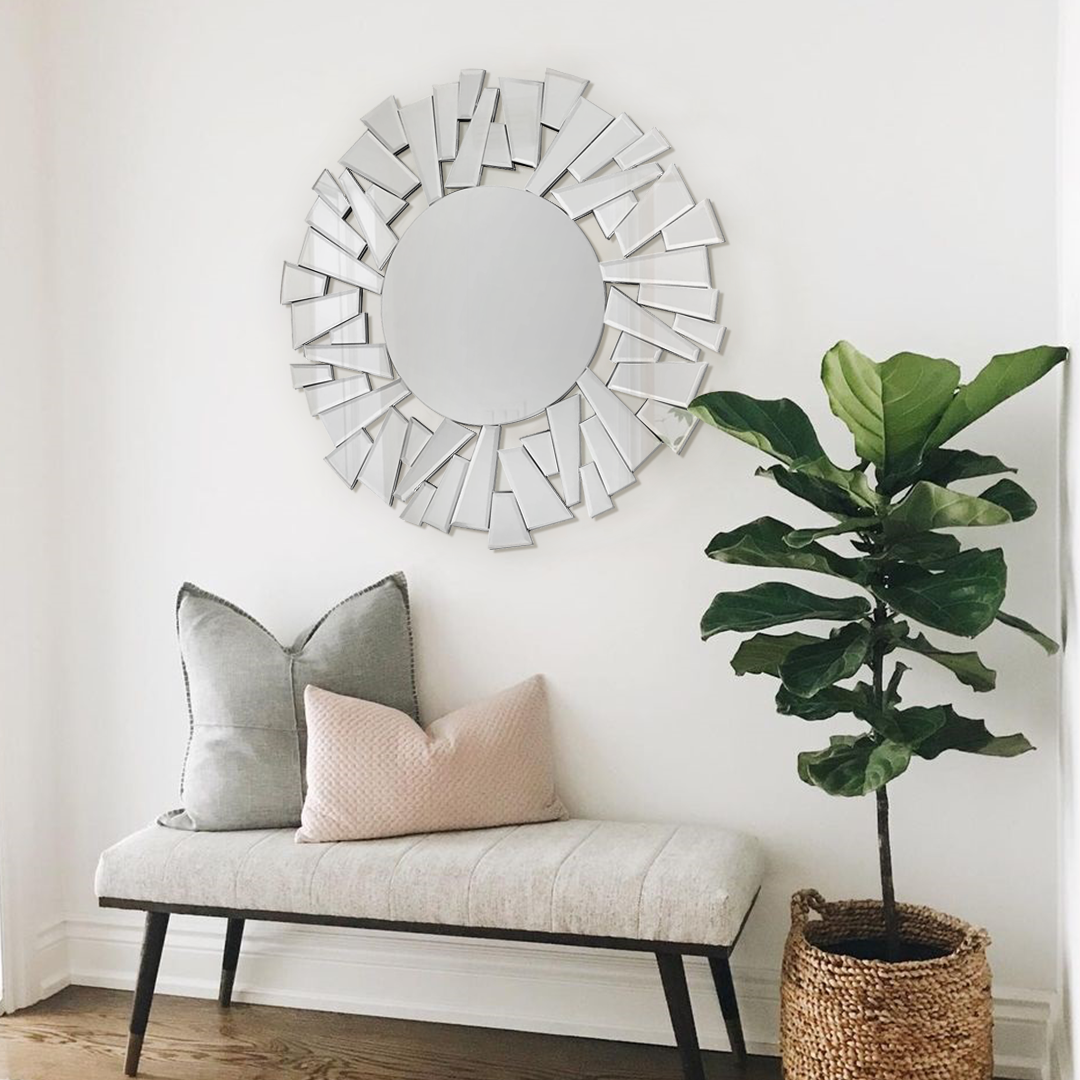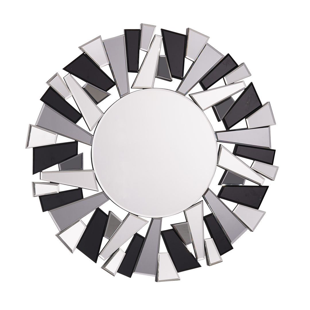 A truly unique mirror featuring a mosaic of eye-catching triangular mirrors intricately framing a central circular mirror. Playing with light from various angles the Theresa mirror brightens any space creating a warm and inviting ambiance.