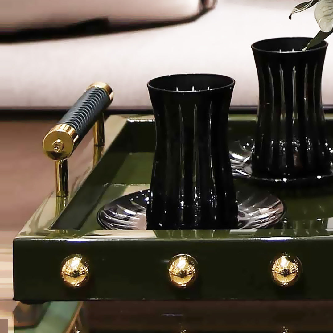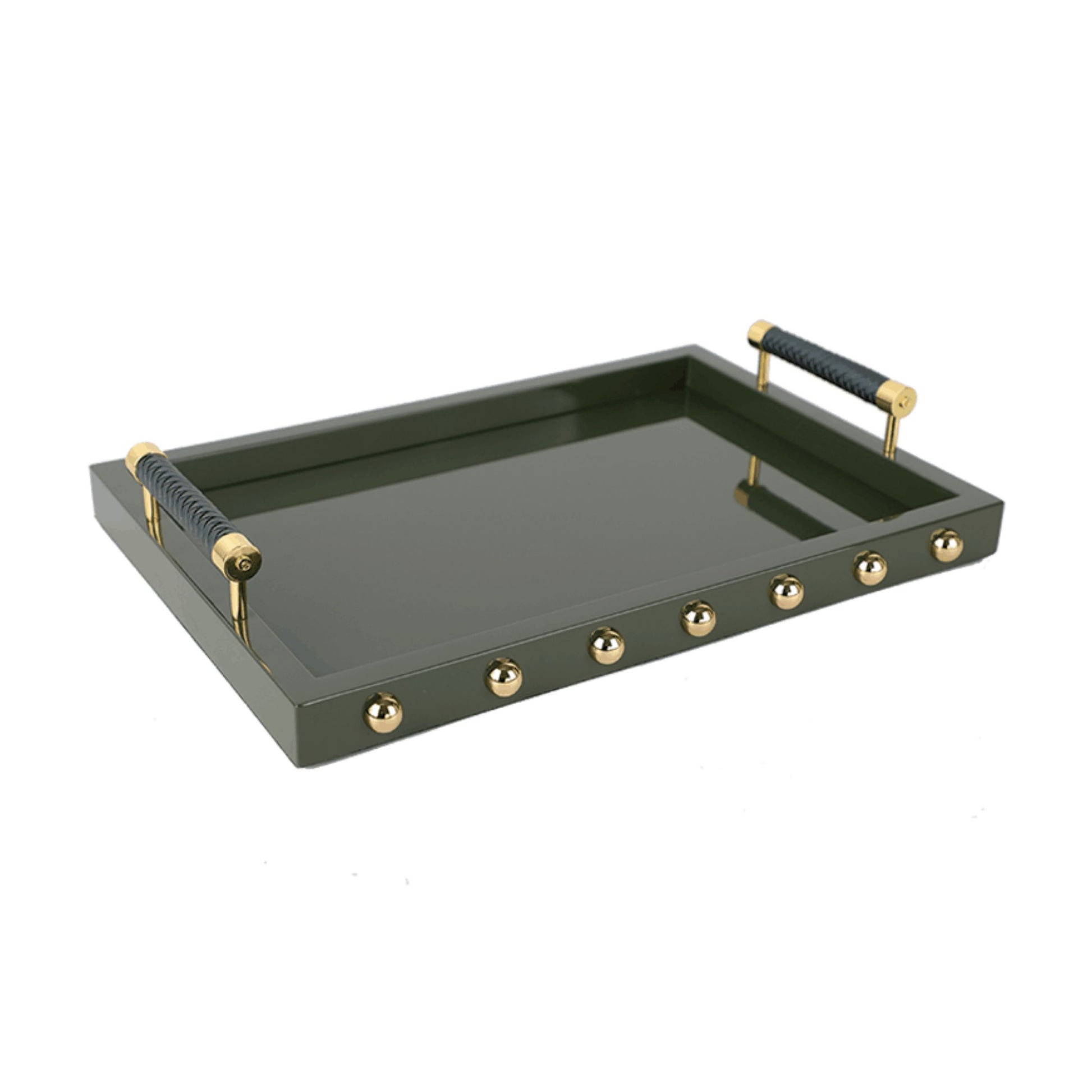 Made from wood, zinc-alloy, and steel, this tray is accented with gold studs is as beautiful as it is versatile. The distinctive deep green hue make it truly a statement piece your home.