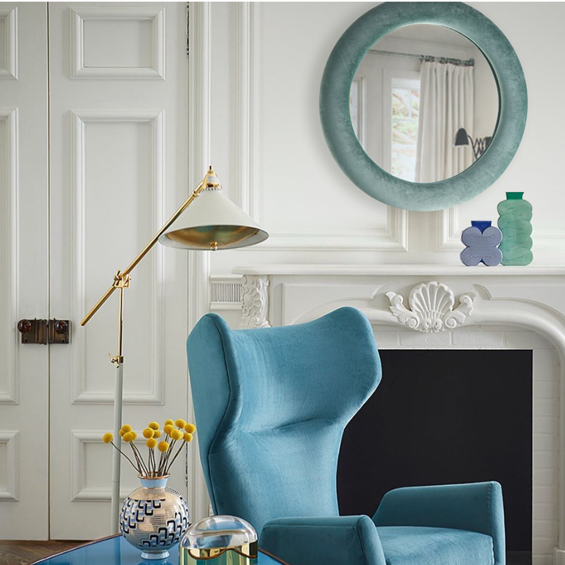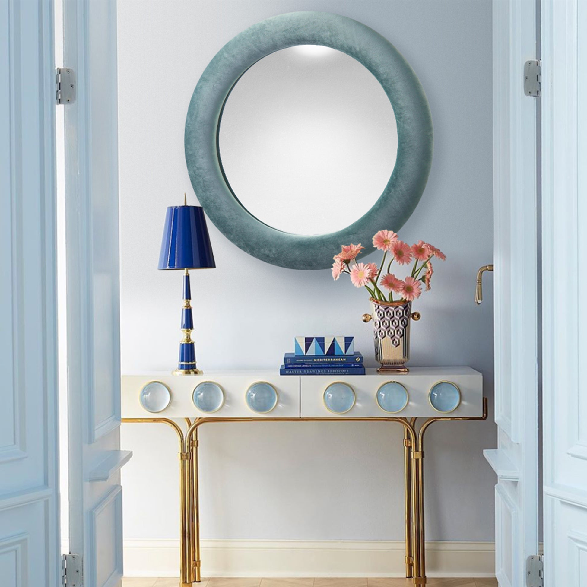 Looking for an ultramodern and stylish piece for your home? Plush meets polish in this simple yet stunning round mirror ensconced in a teal velour fabric. Match it up with your room's color palette for a perfectly coordinated interior designer look.