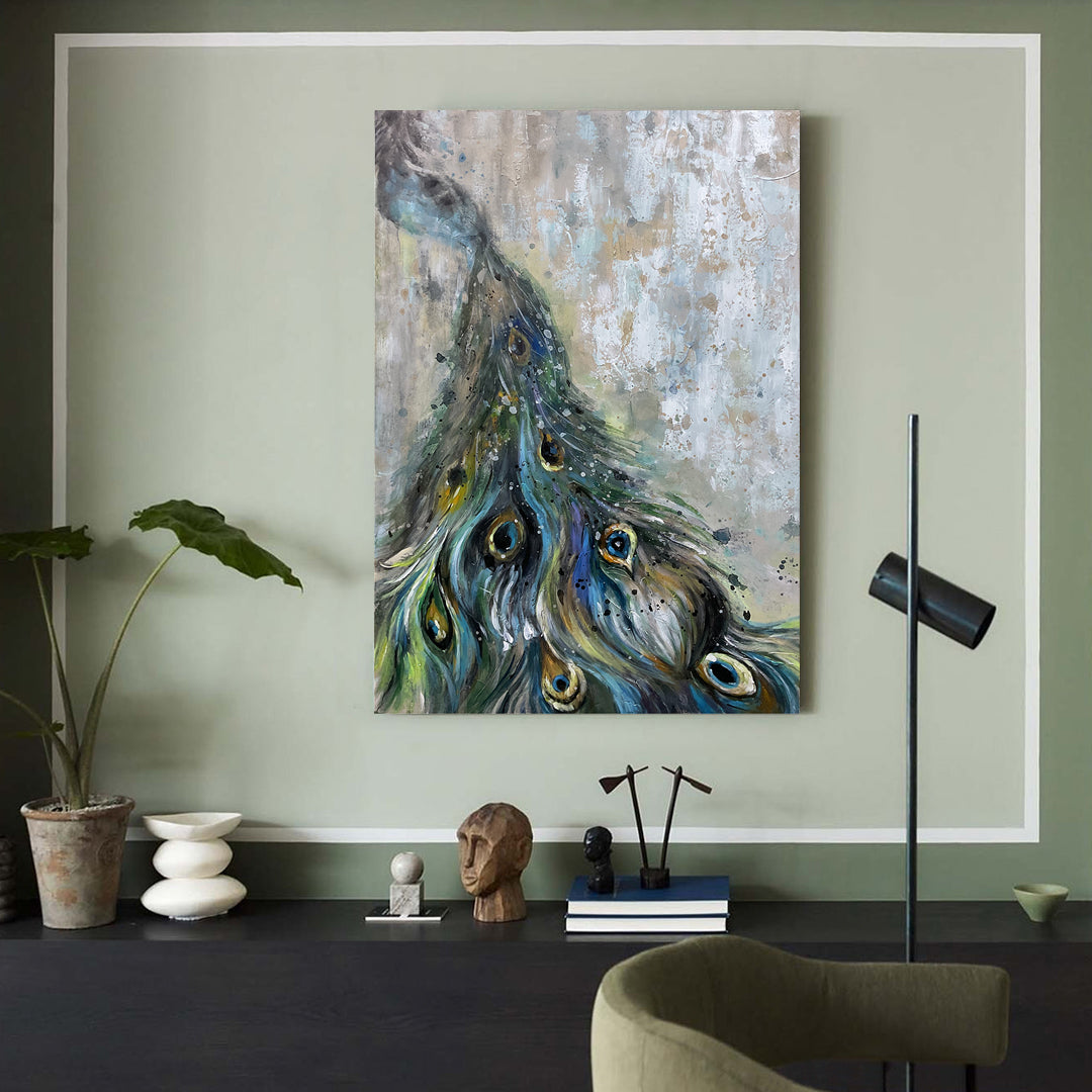 Peacock feathers unfold in a mesmerizing swirl of emerald, sapphire, and gold, each eye-like pattern shimmering with beauty and wisdom. Revered as a symbol of fortune and protection, the vibrant plumage invites abundance and eternal allure into every space.