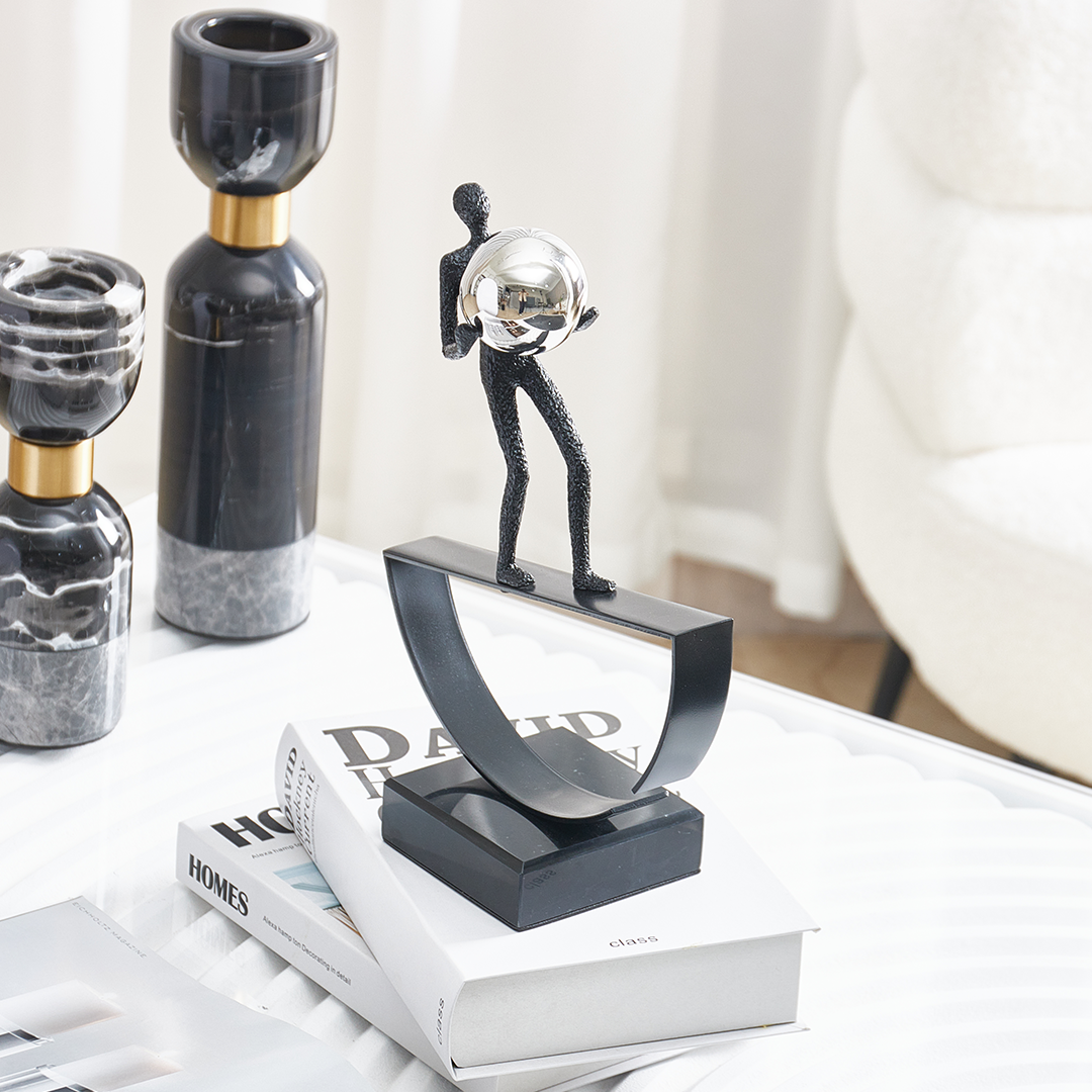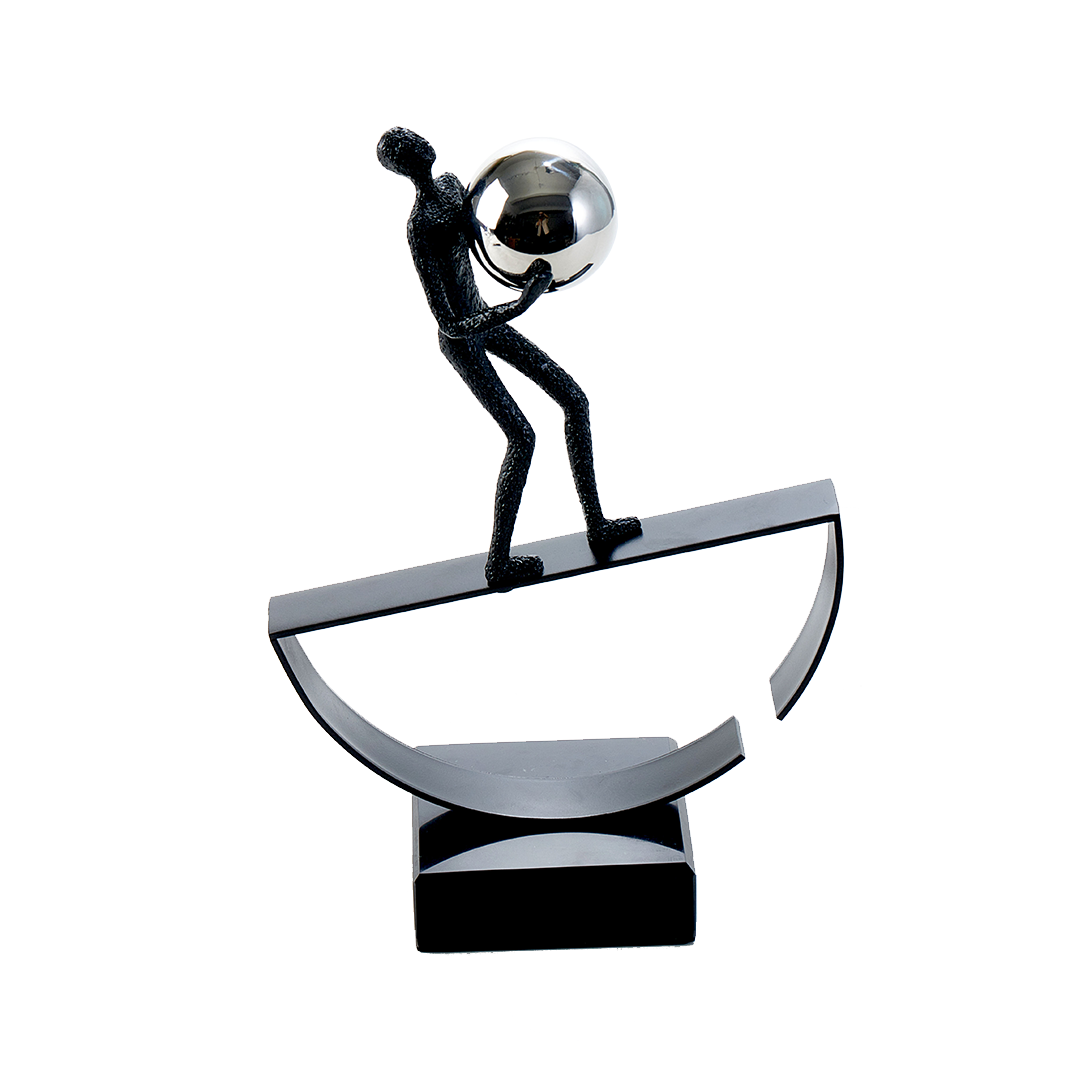 A perfect piece for high-flying achievers who literally and figuratively hold the world in their hand. This striking sculpture depicts a human holding a gleaming silver ball, poised atop a hollow semi-circle. Whether displayed on a tabletop, a shelf, or a mantelpiece, this unique décor serves as a stylish and versatile accent that complements a variety of interior styles.